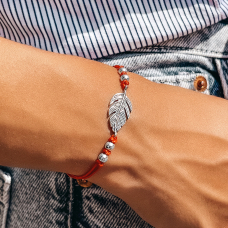 Браслет на червоній шовковій нитці зі срібними вставками.