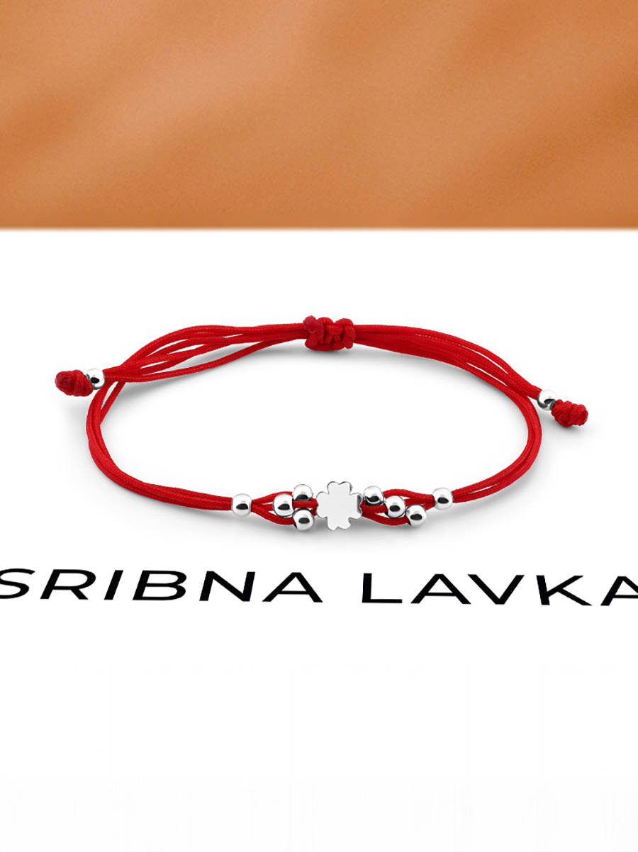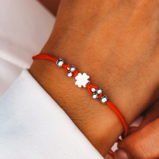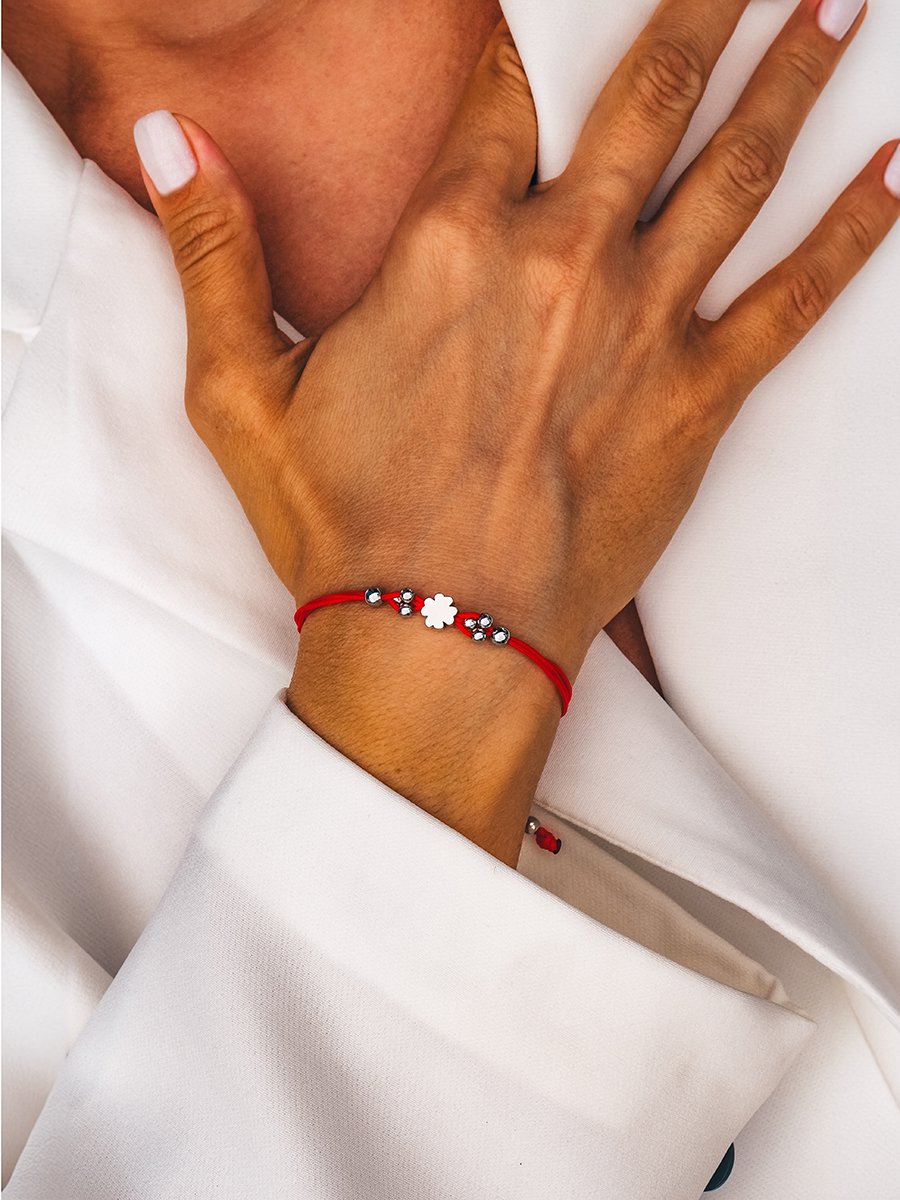 Браслет на червоній нитці зі срібним чотирилисником та кульками.