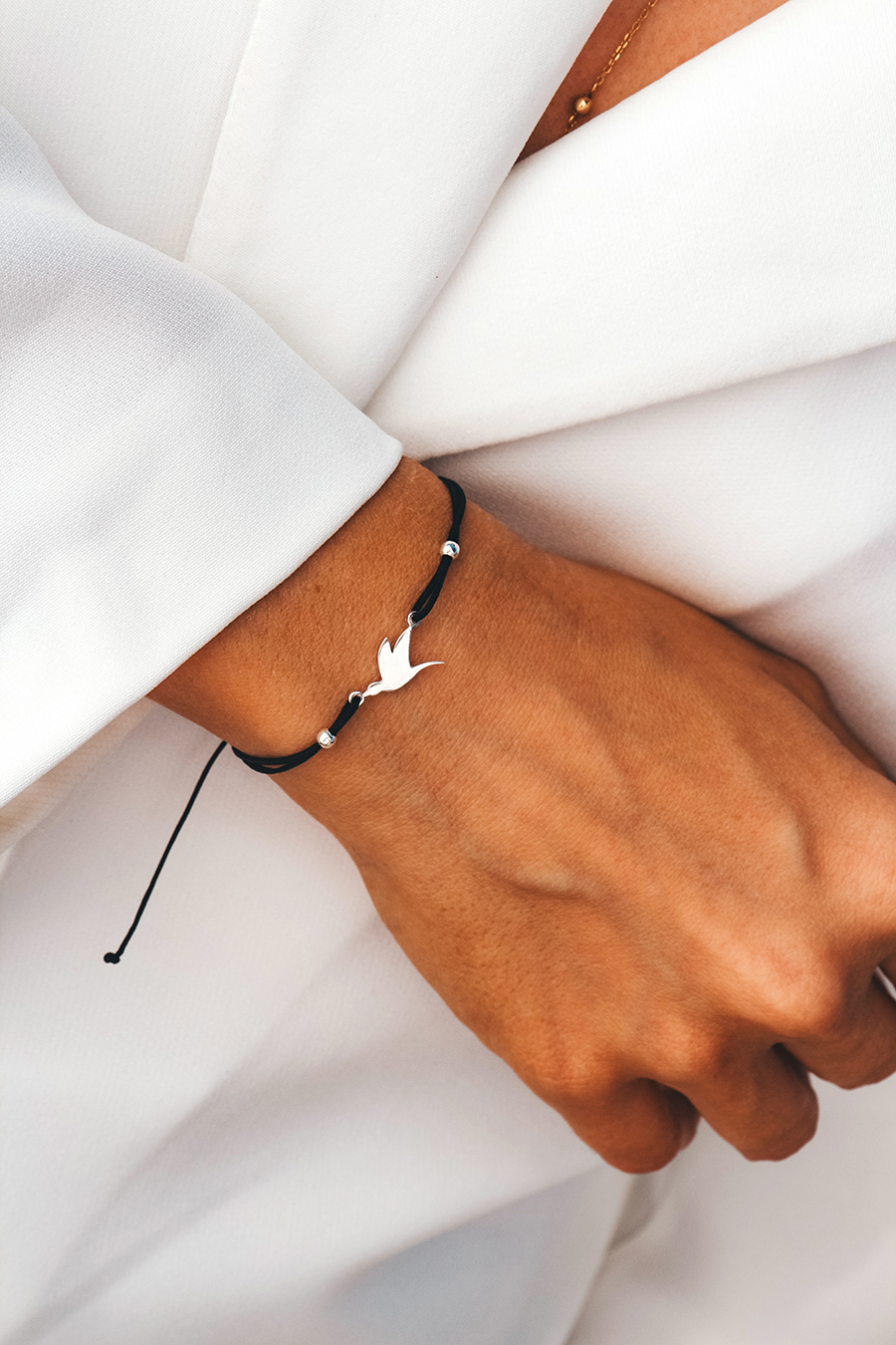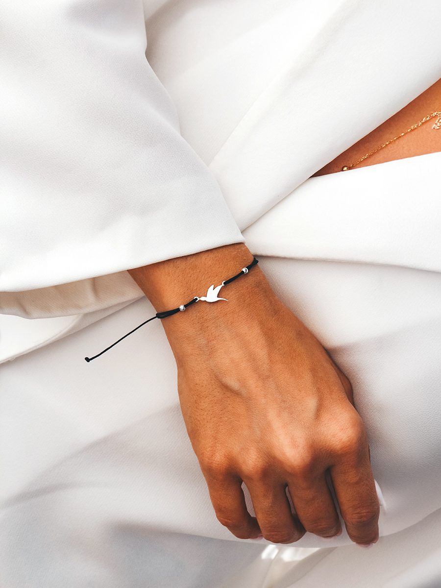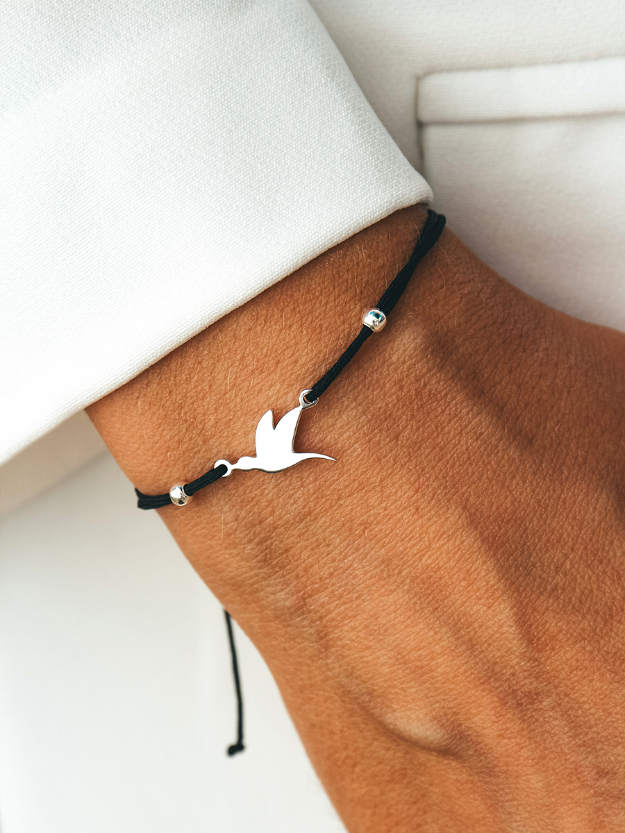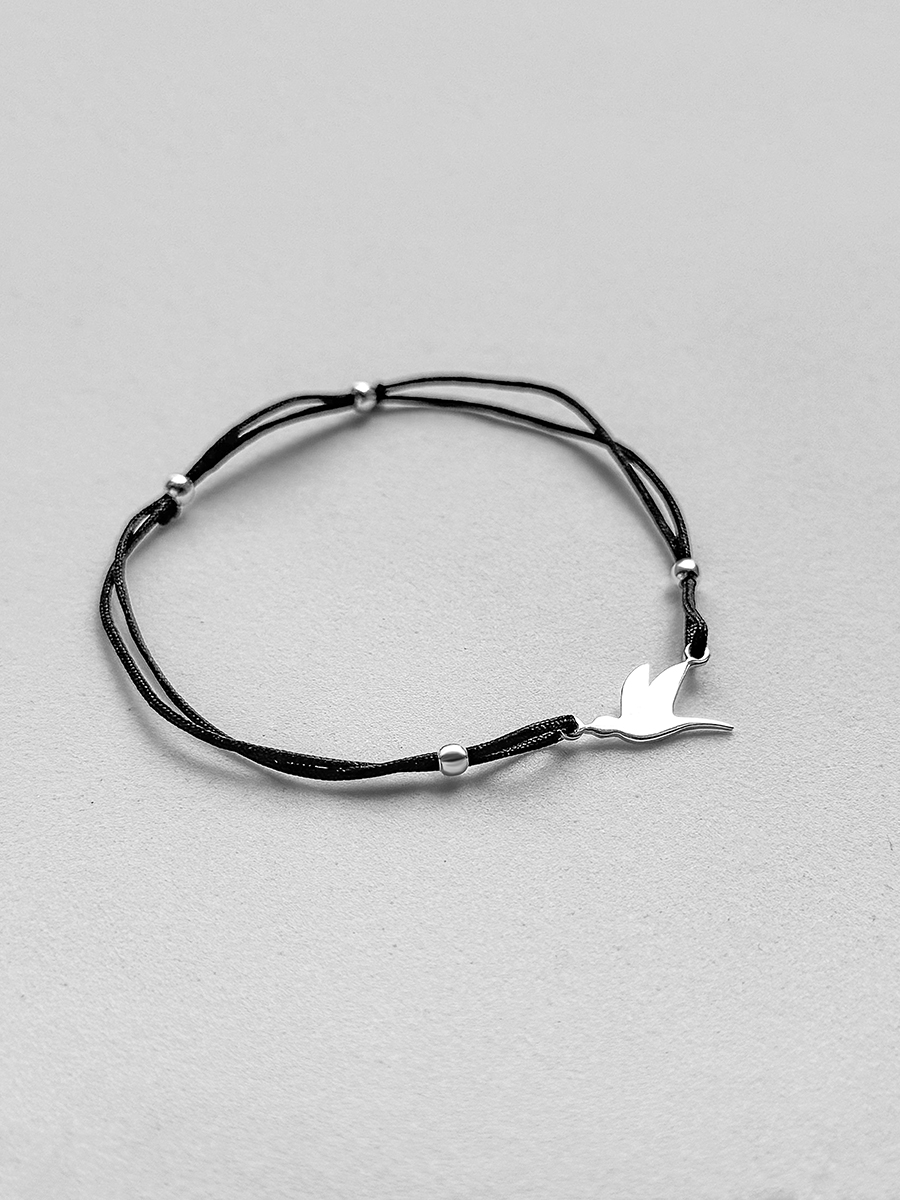 Браслет на шовковій ниточці зі срібною ластівкою та кульками. Регулюється до 18 розміру.
