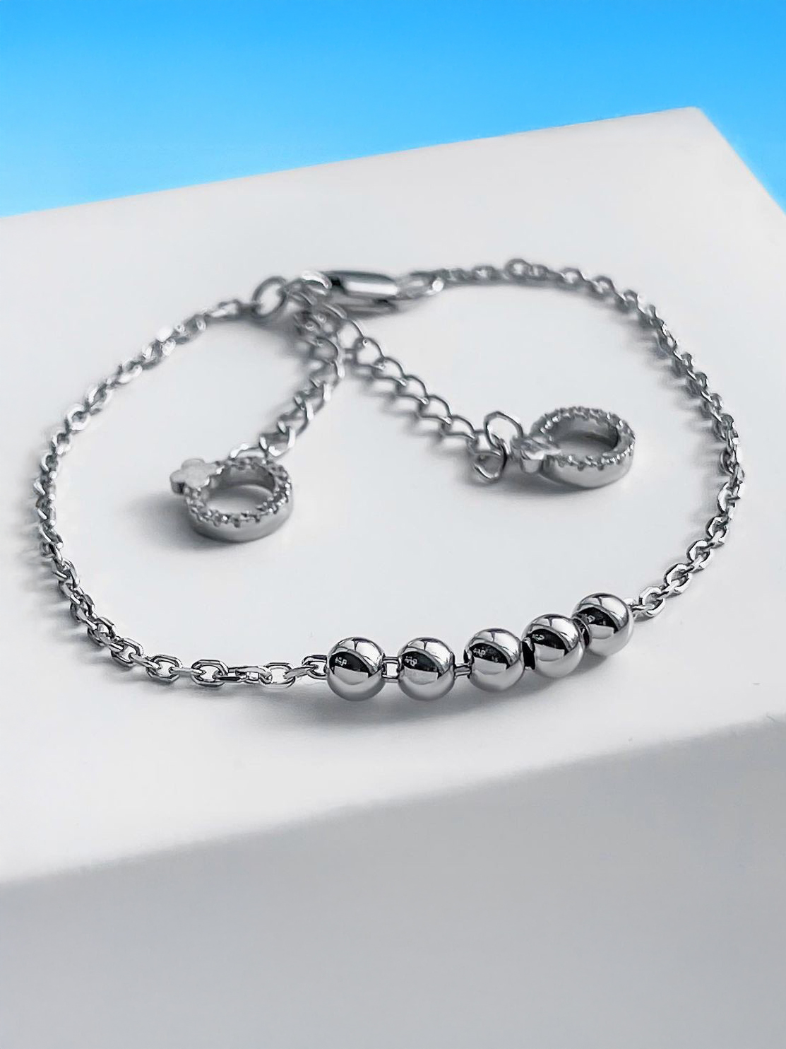 Стильний срібний браслет з кульками та підвісками.
