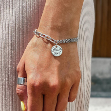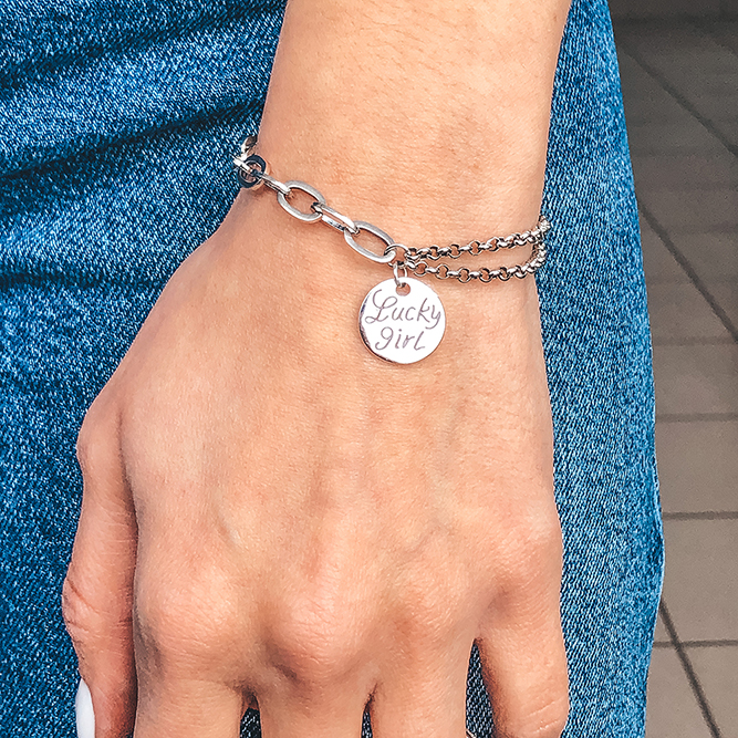 Трендовий срібний браслет ручної роботи з різними ланцюжками та підвіскою-монеткою з надписом ""Lucky Girl