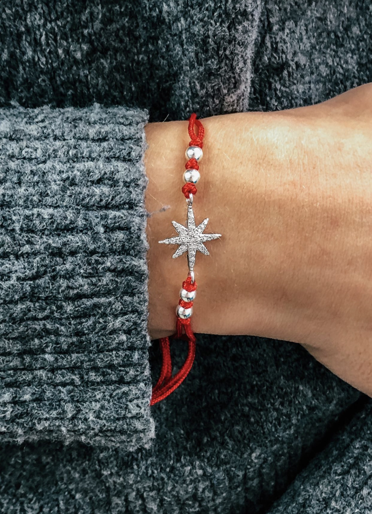 Браслет на червоній нитці зі срібними вставками.