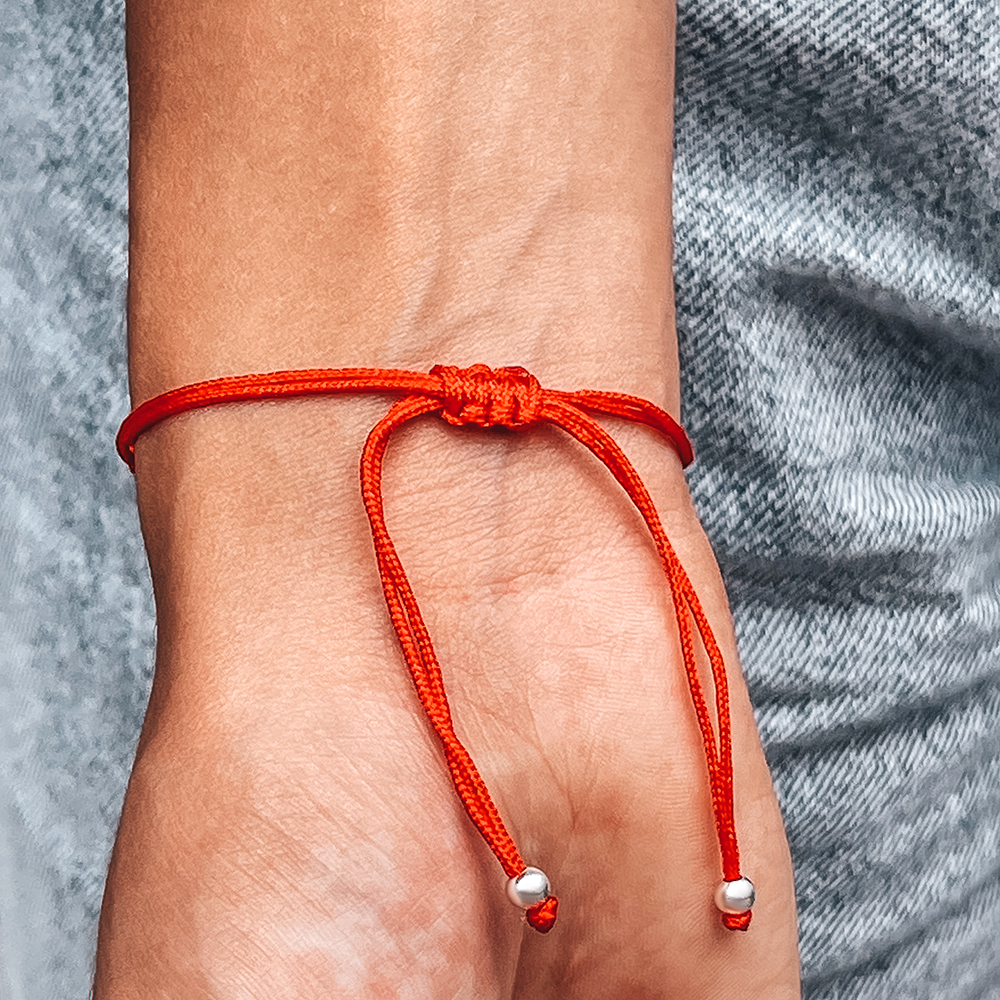 Браслет на червоній нитці зі срібними вставками.