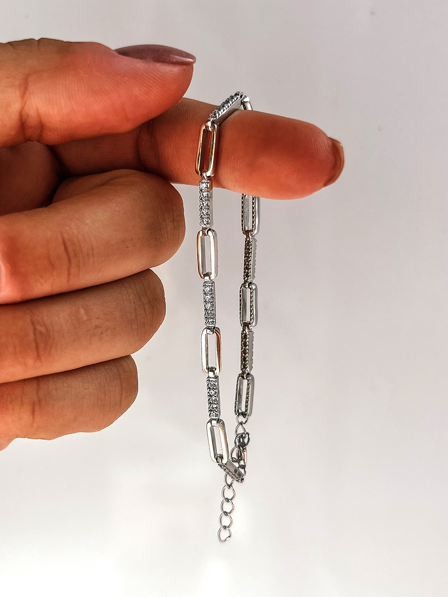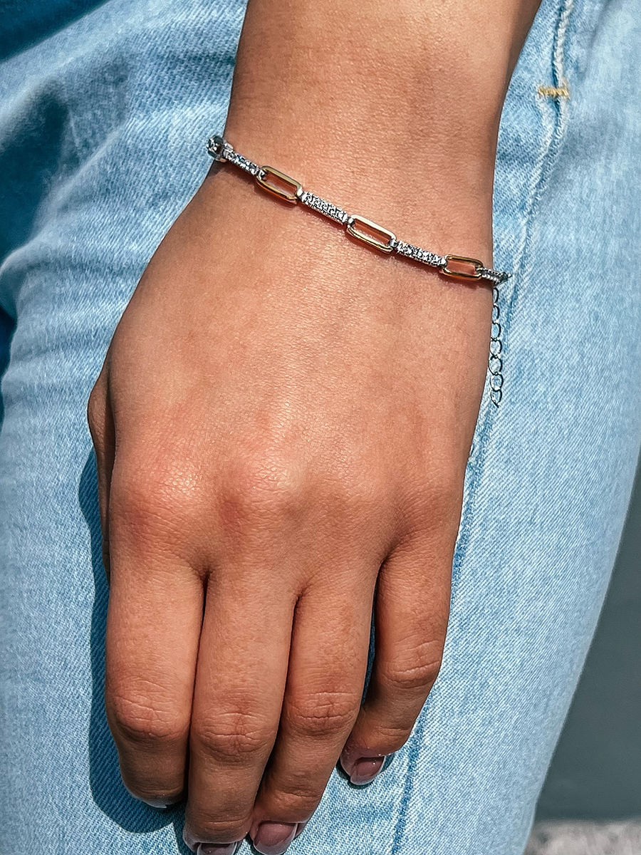 Довершений вручну срібний браслет з фіанітами та вставками натурального золота. Прикрасу оснощено регулятором розміру.