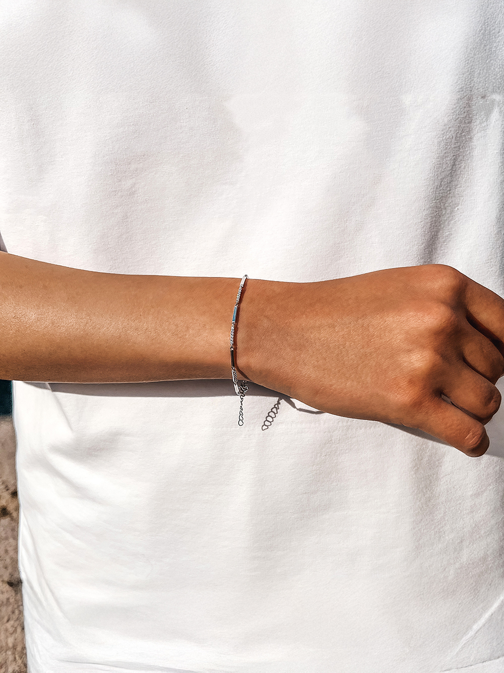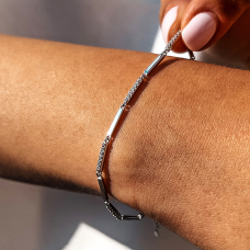 Silver bracelet with rhodium coating and cubic zirconia.