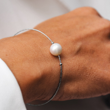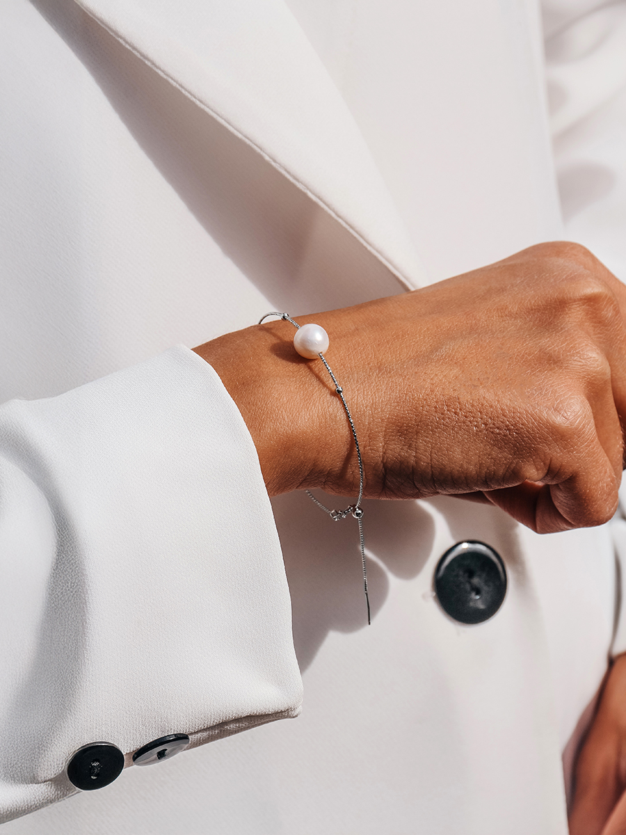 Gentle and elegant silver bracelet with a natural pearl. The size is adjustable using a slider fastener. The pearl can be removed and get a minimalist design.
