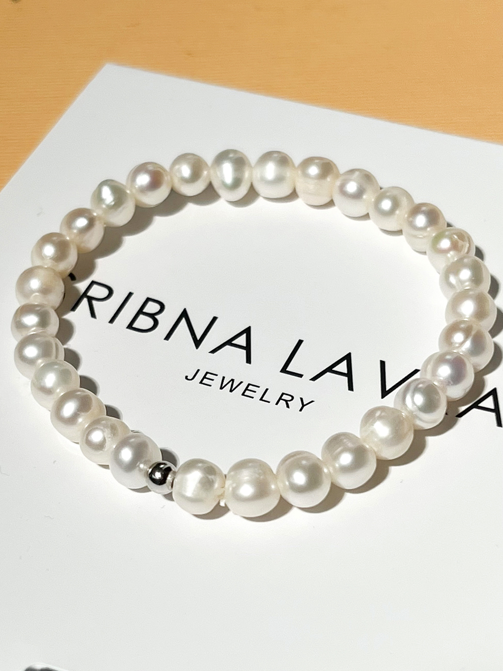 A stylish bracelet made of natural freshwater pearls and a silver ball in the center. The base is a jewelry rubber vein.