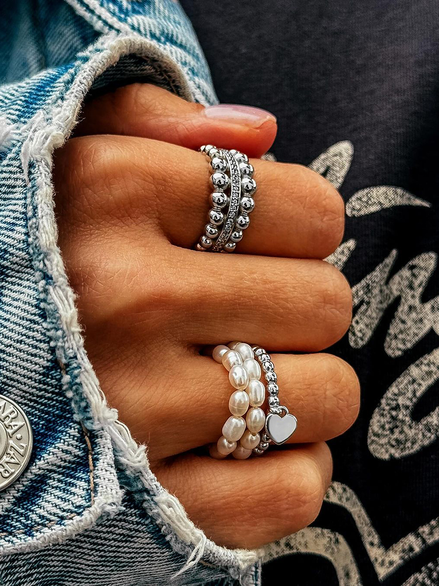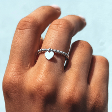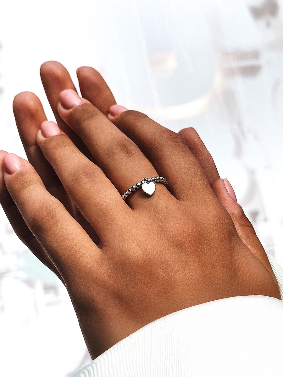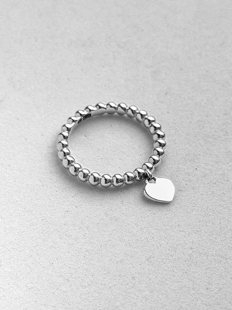 A minimalist ring in the form of beads in shiny silver and decorated with a pendant in the shape of a heart. The jewelry is easy to style and can be worn both alone and in combination with other rings.