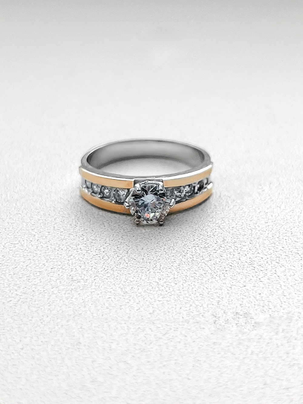 Silver ring decorated with natural gold inserts and diamond-cut cubic zirconia.