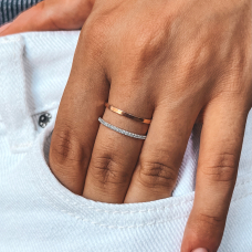 A double silver ring with inserts of gold and bright cubic zirconias.