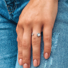 Laconic silver ring with mother-of-pearl and rhodium coating. The ring is open, the size is adjustable.
