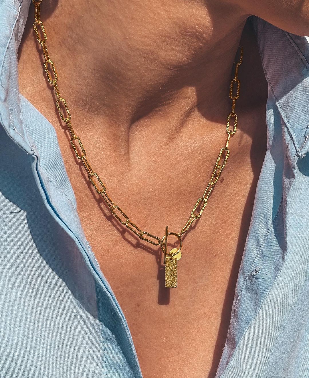 Unusual silver necklace with structural links and gold plating.