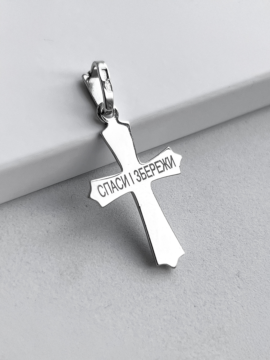 Silver cross with rhodium coating. The size is indicated without the ear.