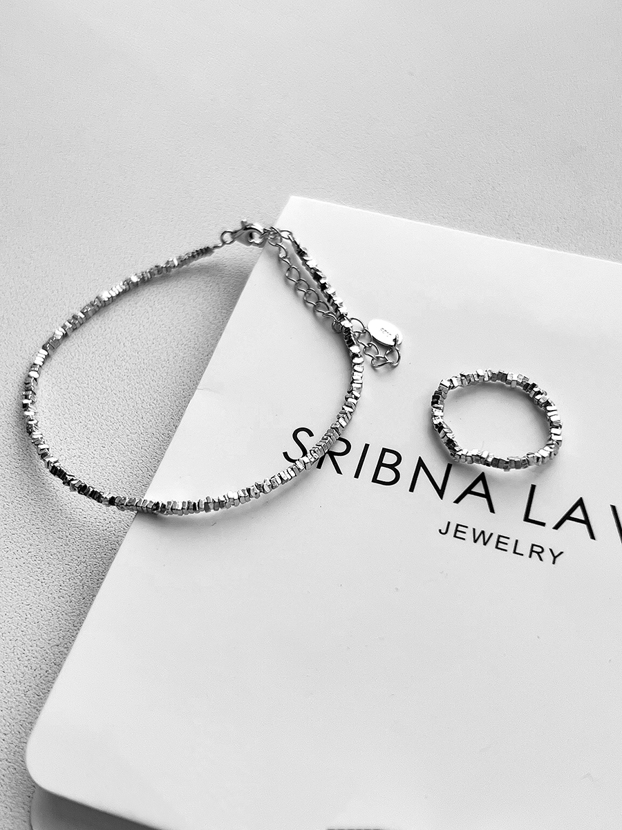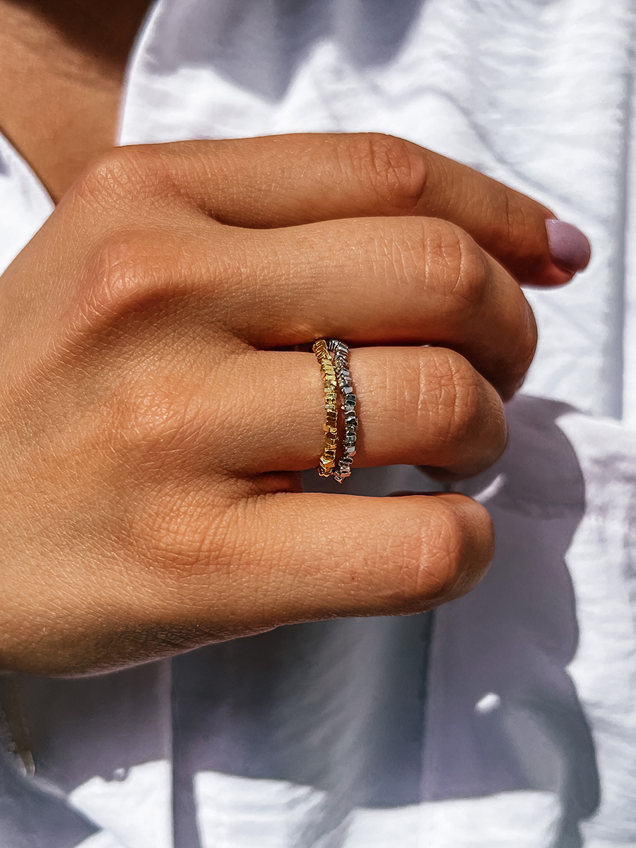 Довершена вручну, оригінальна срібна каблучка. Незвичайний та стильний, ідеально доповнить будь-який образ. Основа - ювелірна гумова жилка, розмір регулюється.