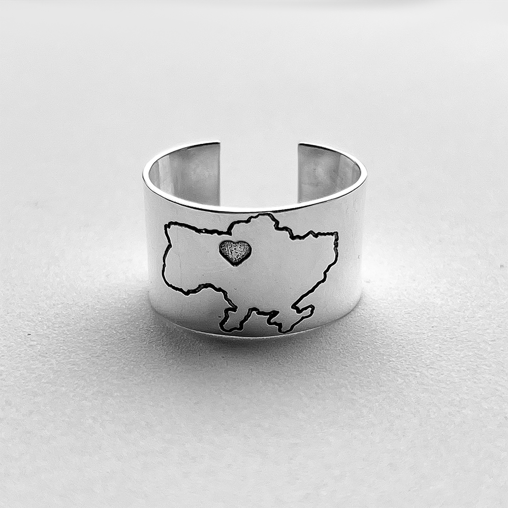 Срібна каблучка з картою України. Каблучка відкрита, розмір регулюється.