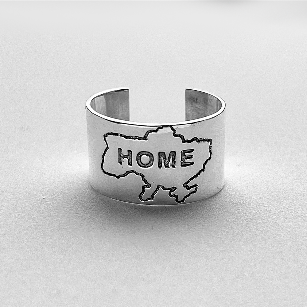 Срібна каблучка з картою України. Каблучка відкрита, розмір регулюється.