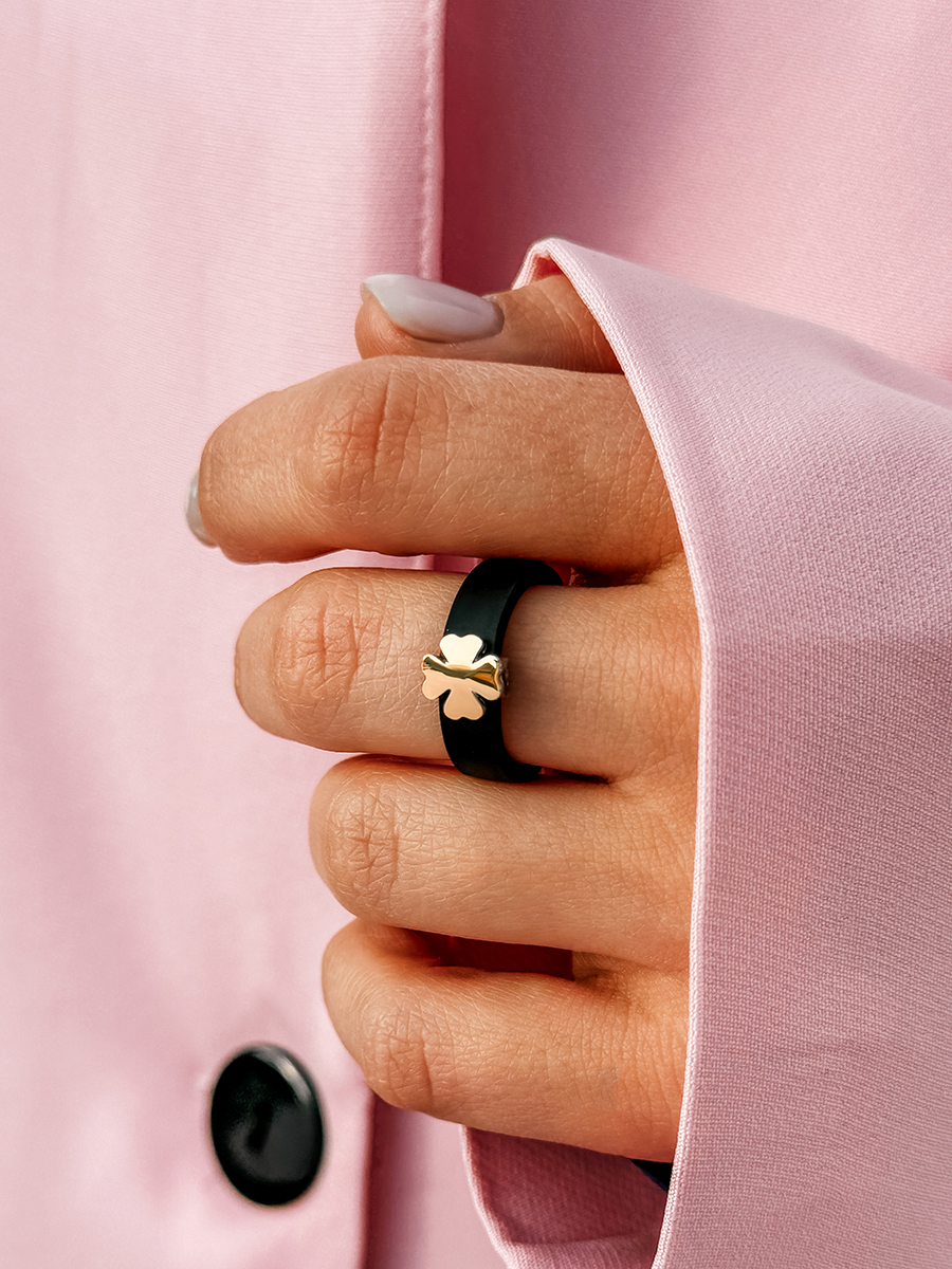Стильна та незвичайна каблучка з золотим чотирилисником, виготовлена з каучуку, срібла та пластини із натурального золота, яке з часом не зникає й не стирається, на відміну від позолоти.