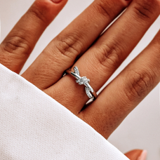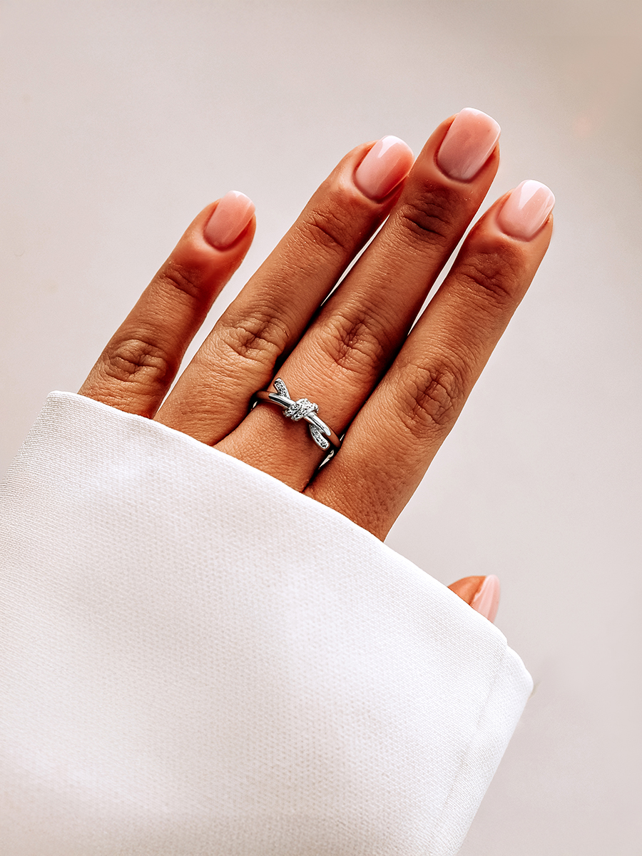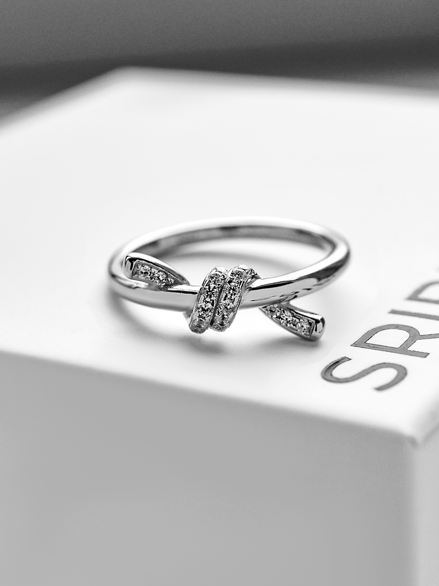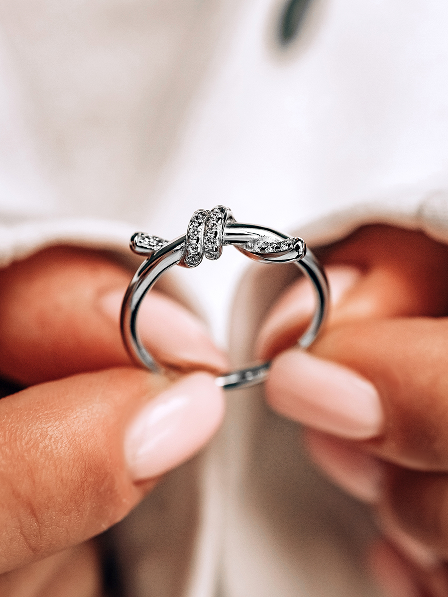 Стильна срібна каблучка у вигляді вузлика з фіанітами. Носіть як самостійну прикрасу, або комбінуйте з іншими кільцями в неповторні сети.