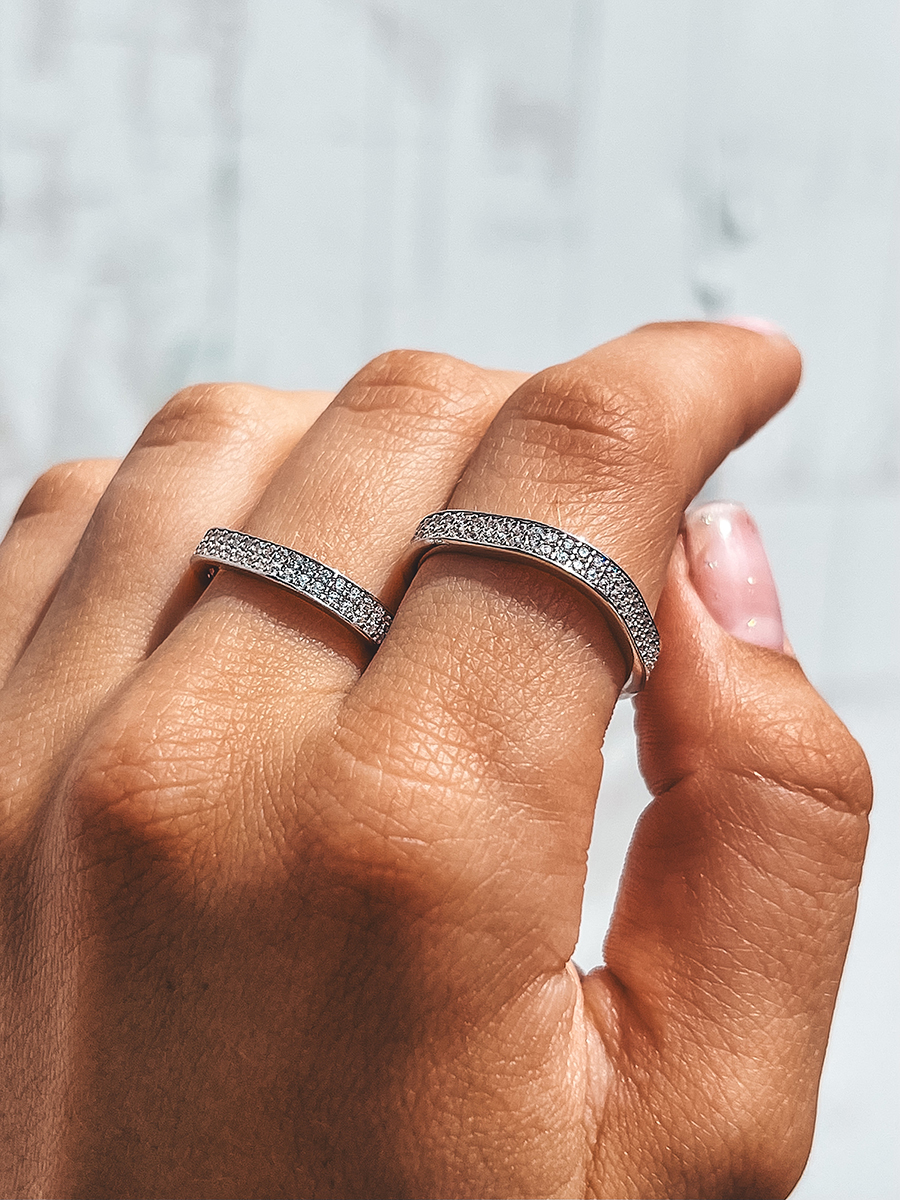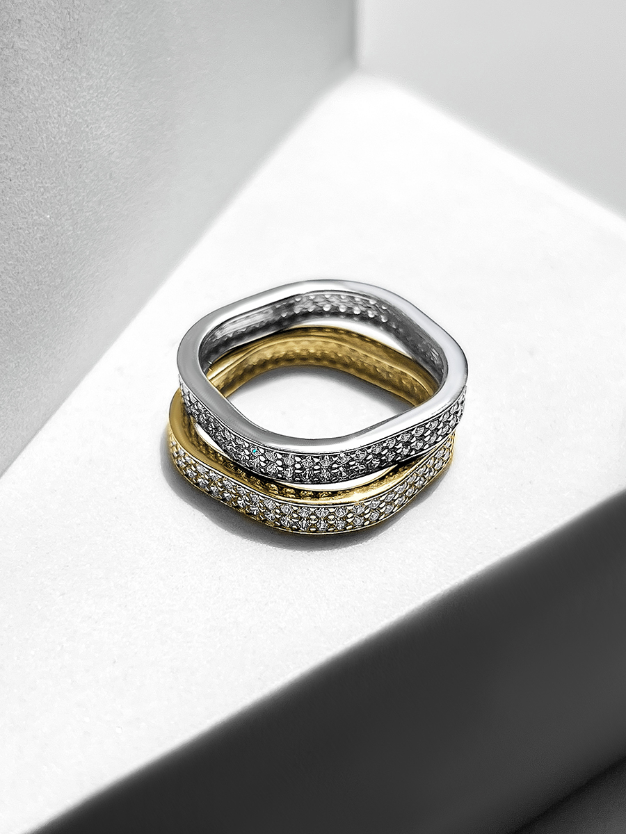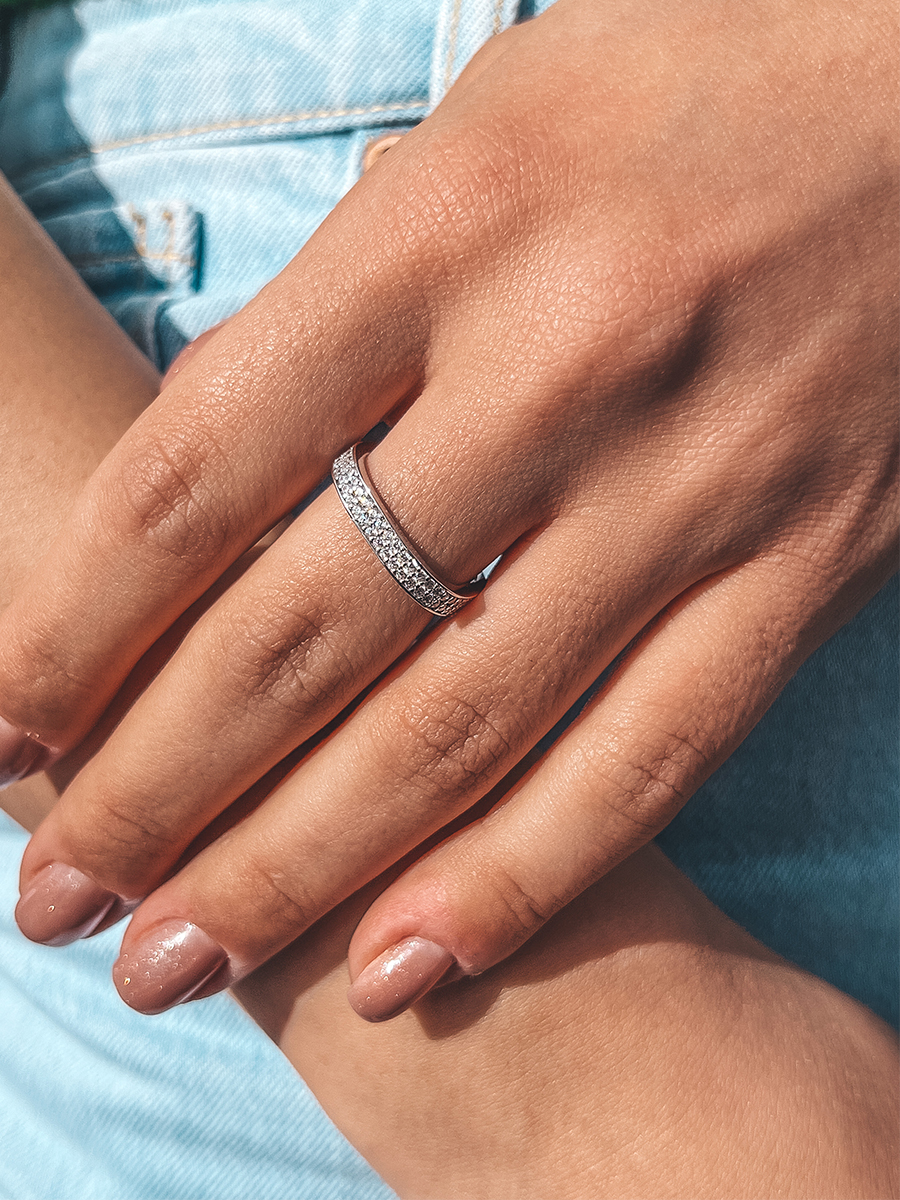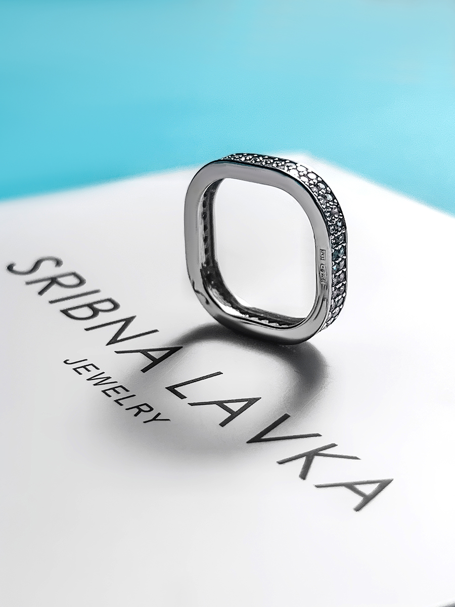 Срібна каблучка незвичайної геометрії, по всій довжині прикрашена фіанітами з діамантовим ограновуванням.