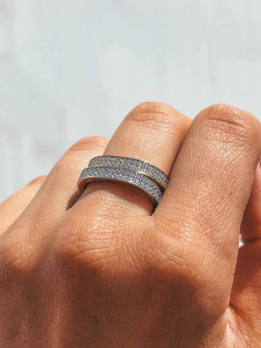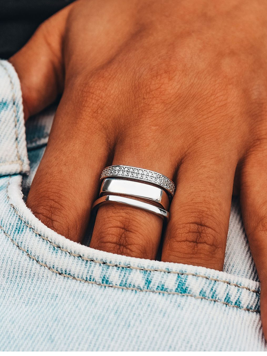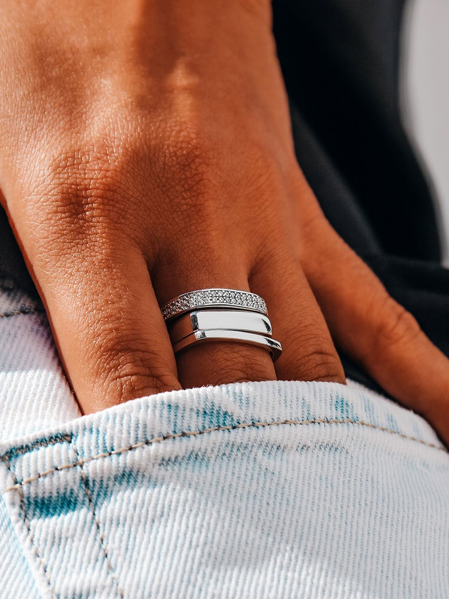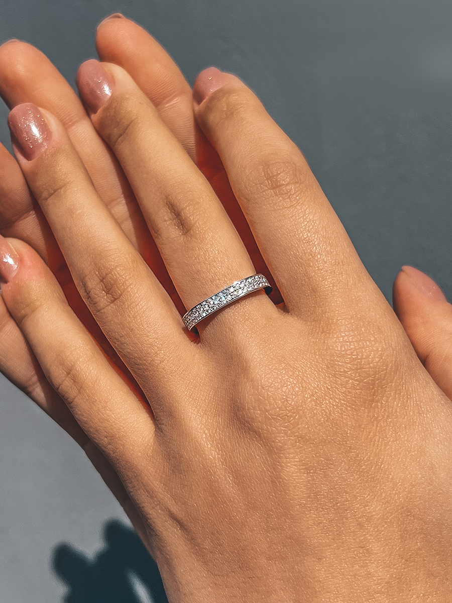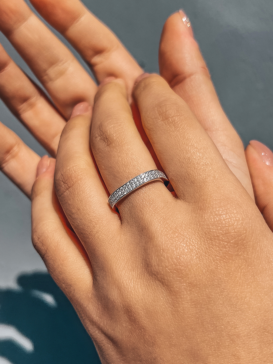 Срібна каблучка незвичайної геометрії, по всій довжині прикрашена фіанітами з діамантовим ограновуванням.