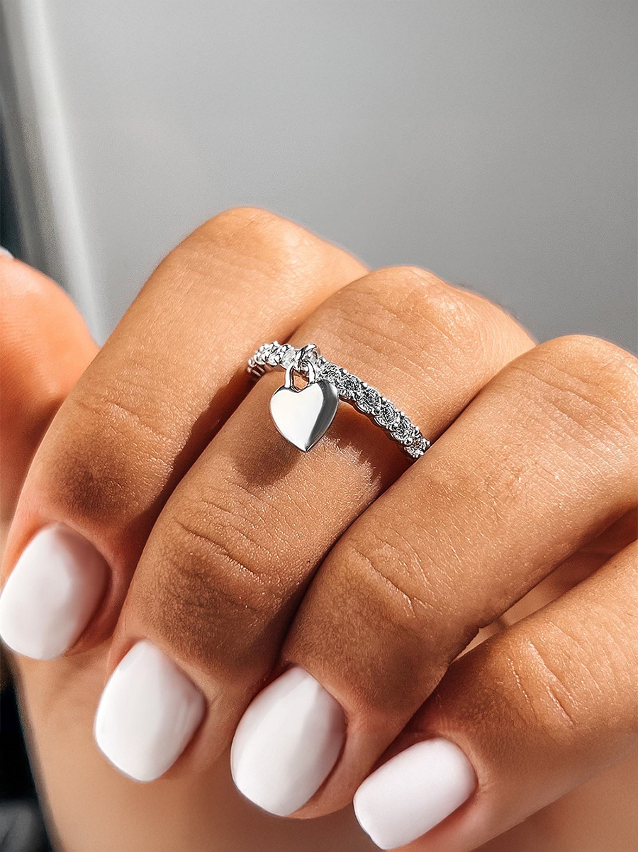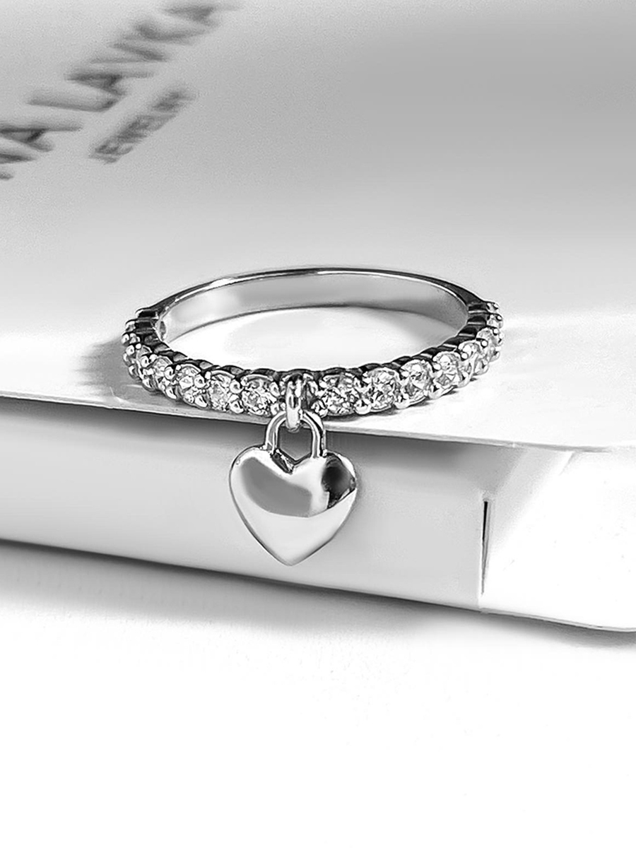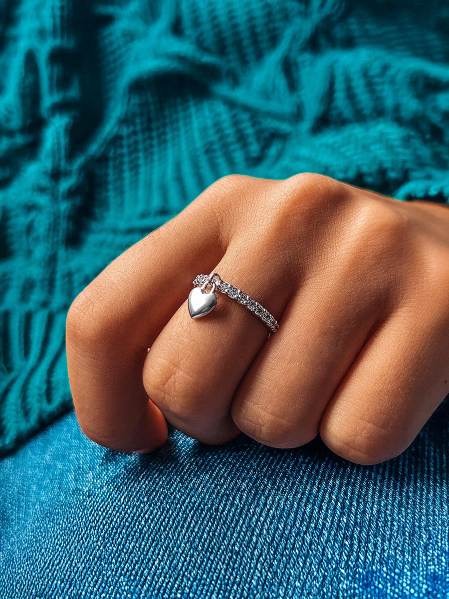 Стильна срібна каблучка оздоблена доріжкою яскравих фіанітів та підвіскою у вигляді серця