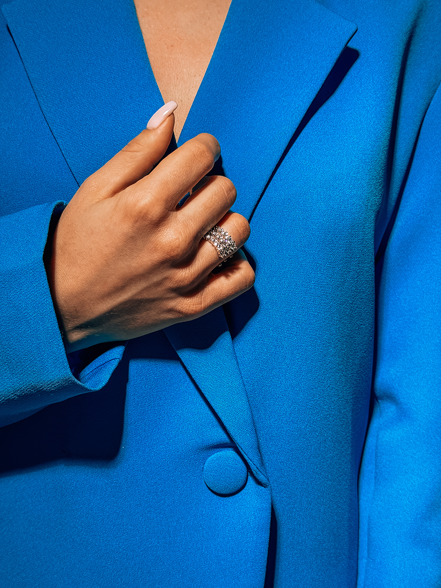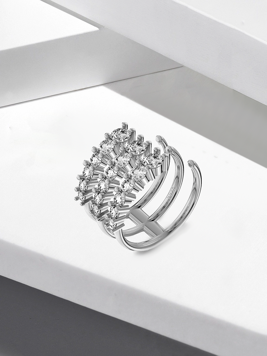 Стильна відкрита срібна каблучка з фіанітами. Розмір регулюється від 16 до 19.