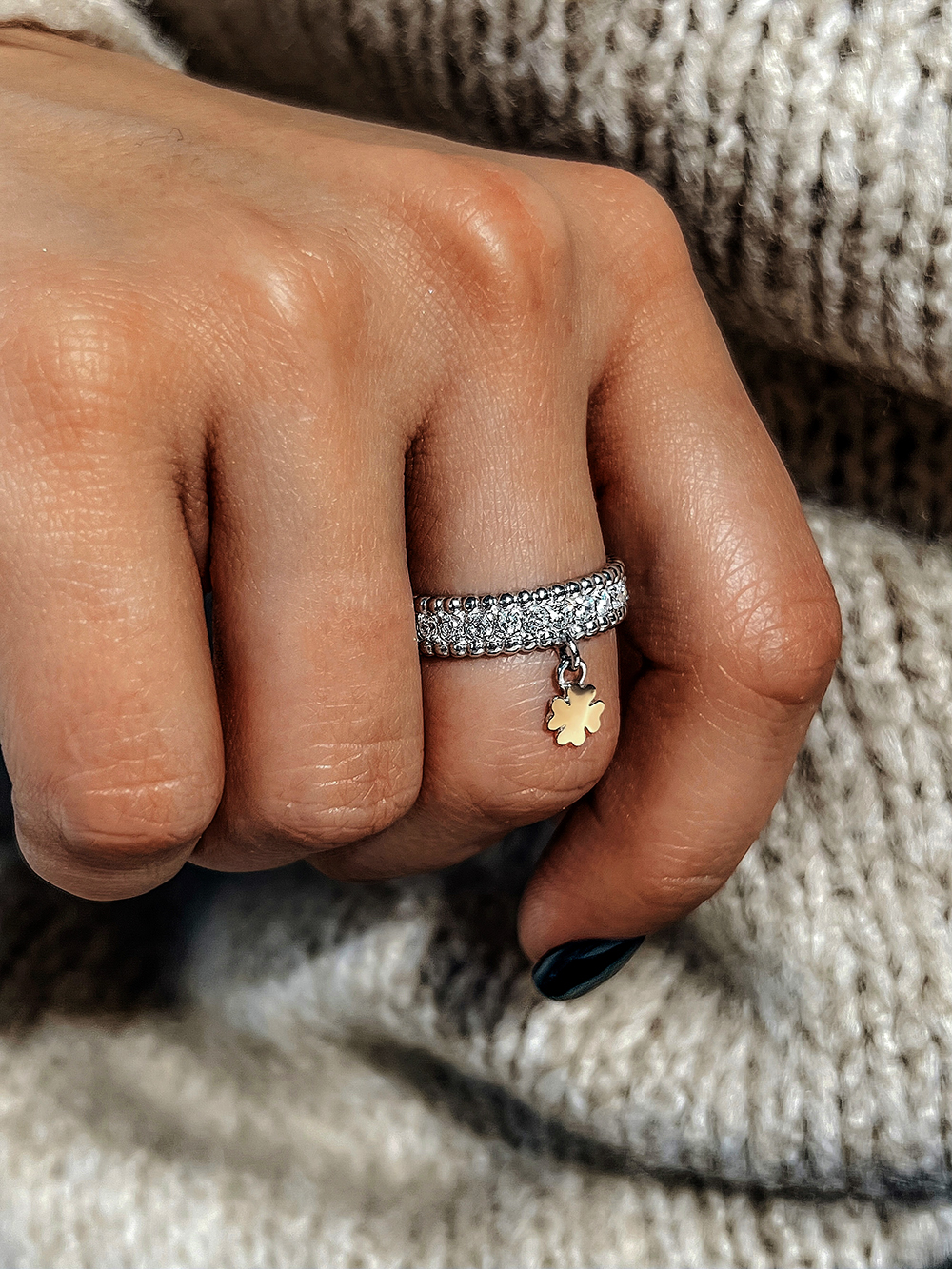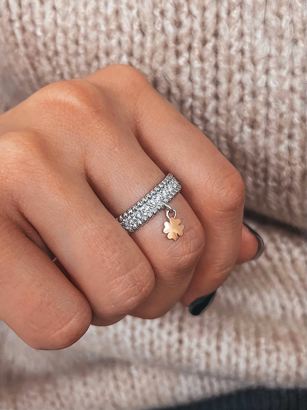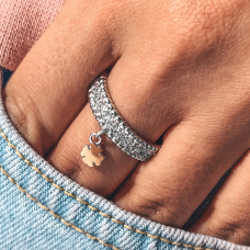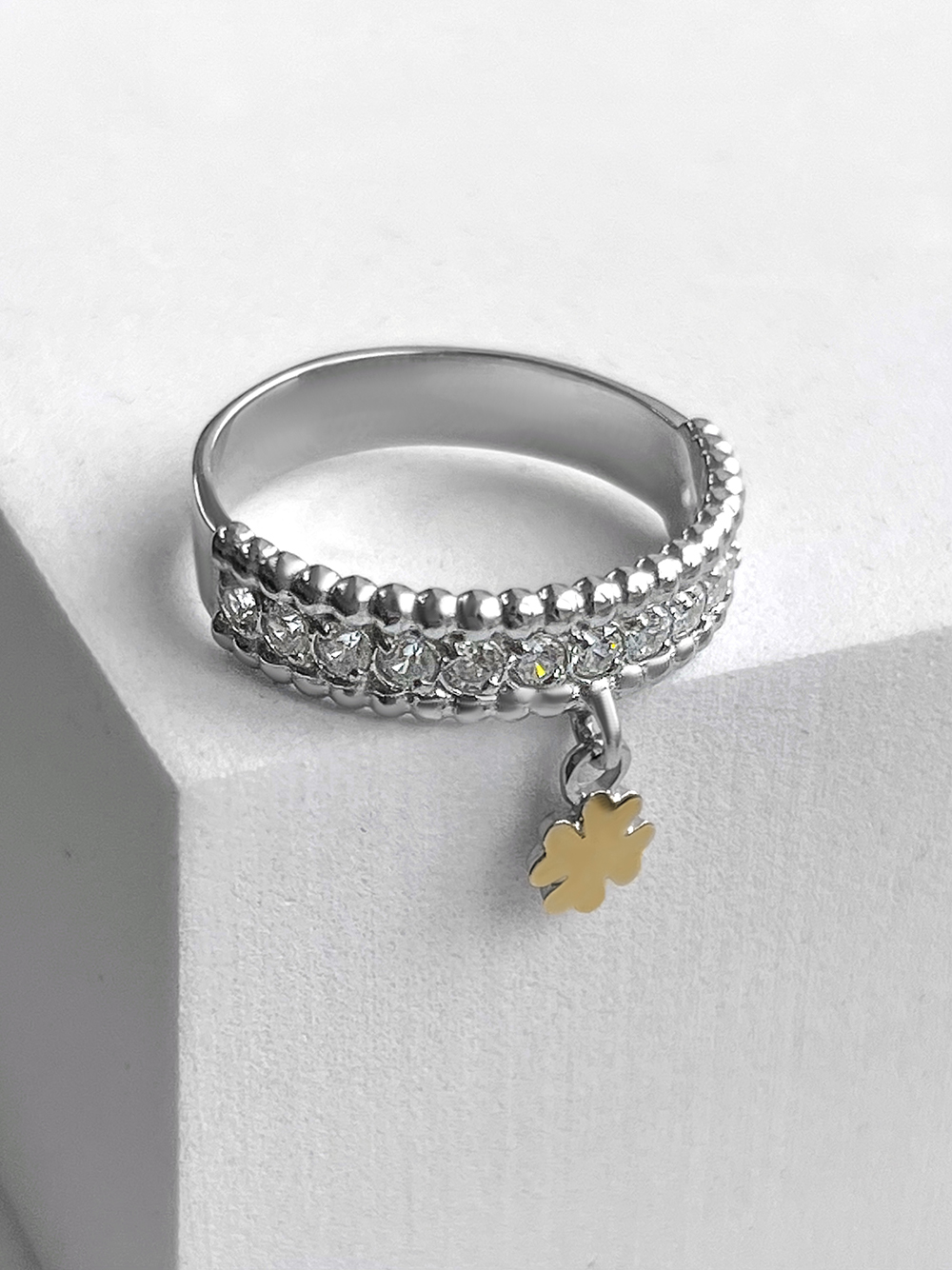Оригінальна срібна каблучка інкрустована фіанітами із діамантовим ограновуванням та підвіскою у вигляді чотирилисника зі вставкою натурального золота.