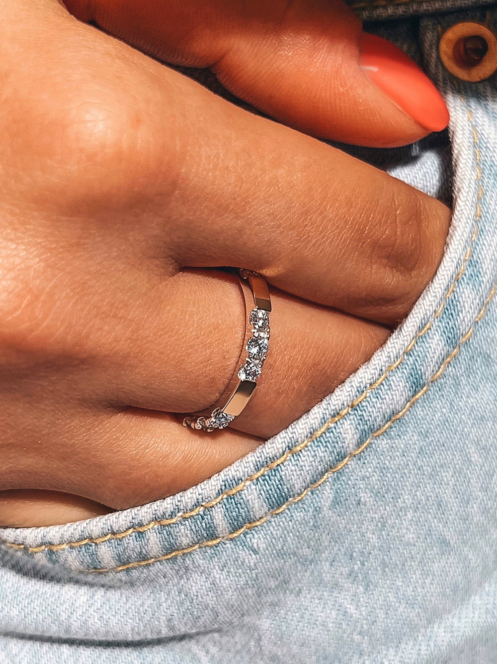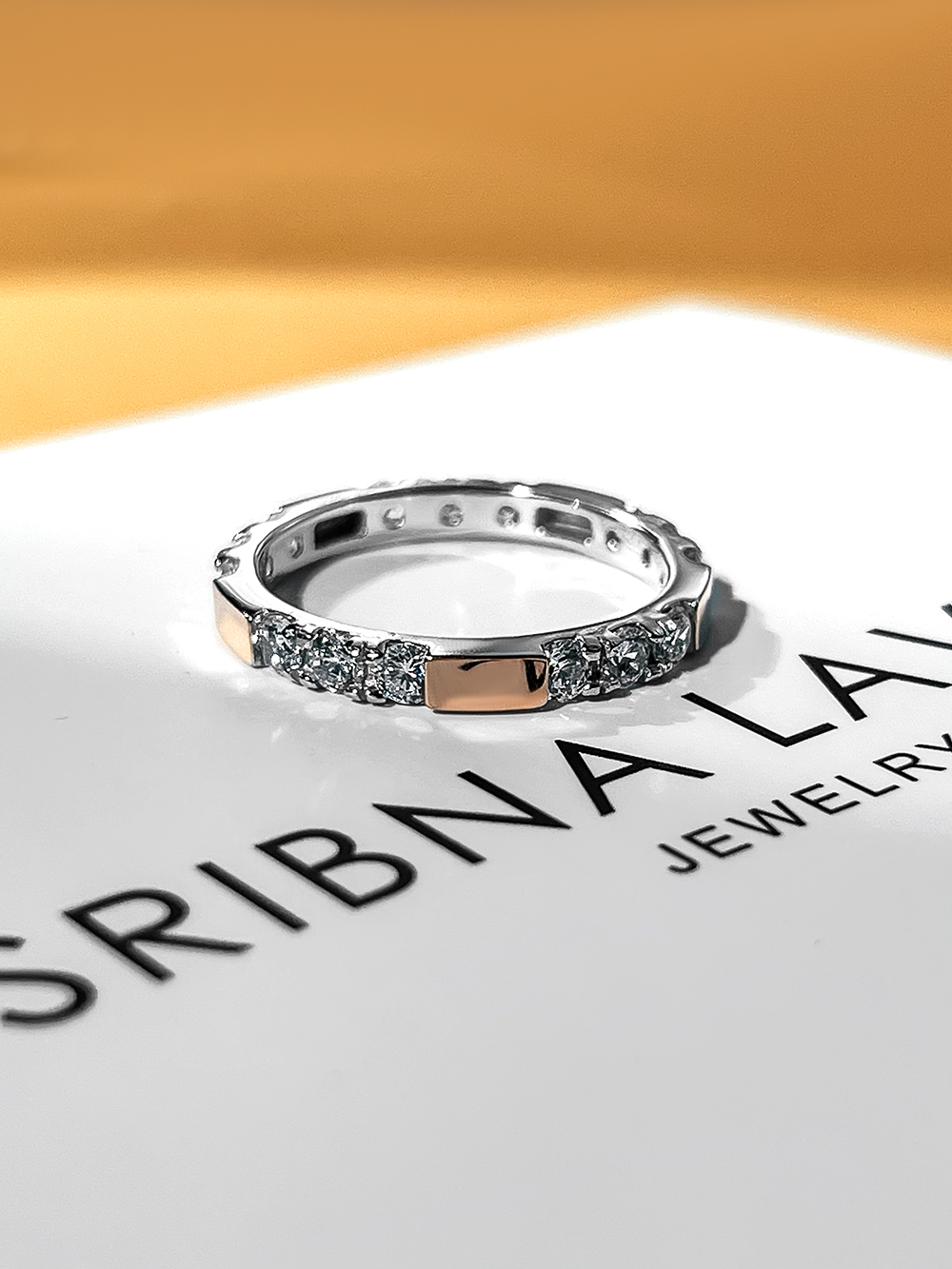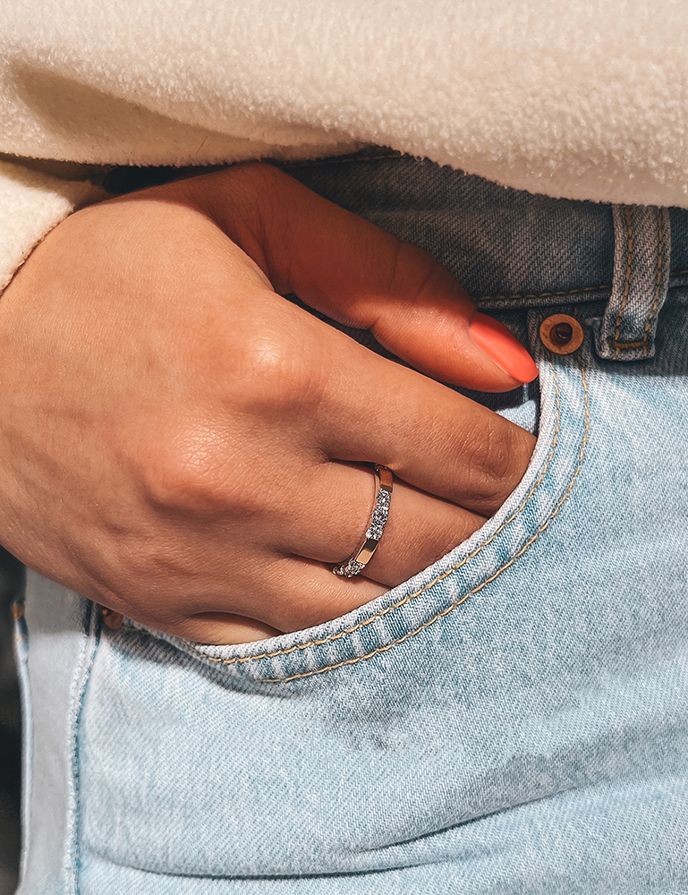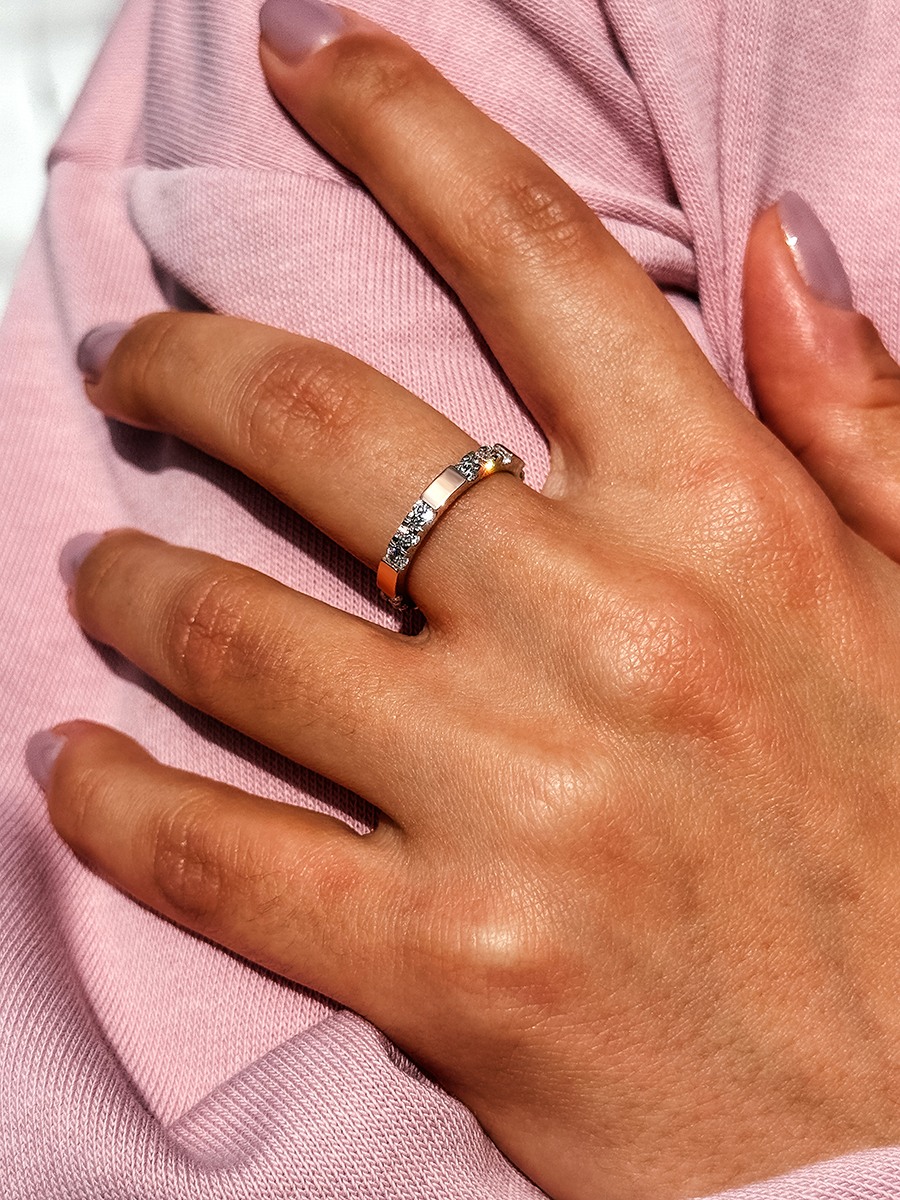Стильна та неповторна срібна каблучка, прикрашена вставками із натурального золота та фіанітами із діамантовим ограновуванням.