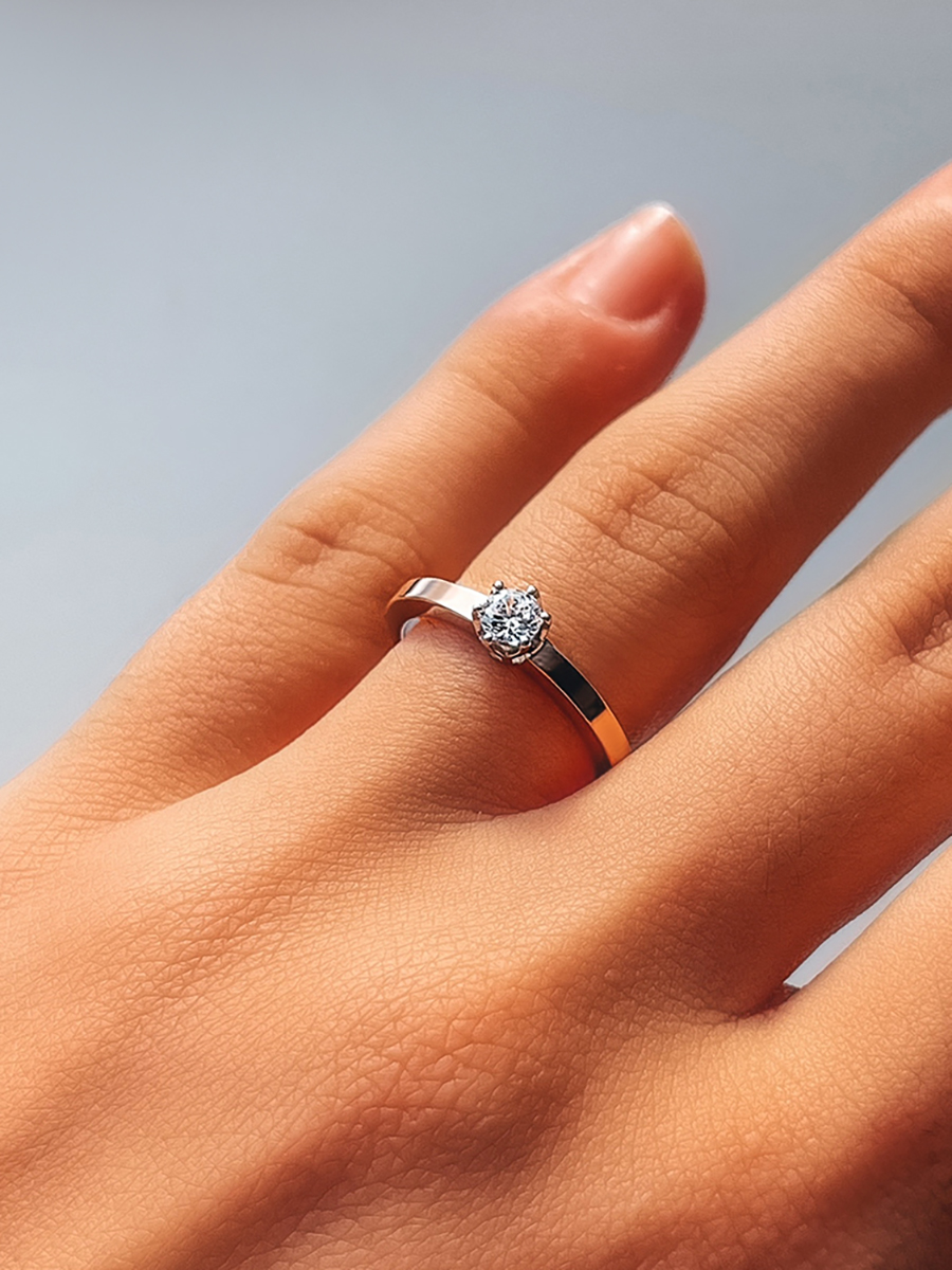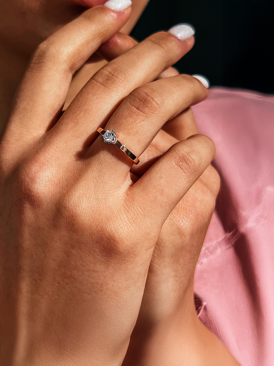 Срібна каблучка, прикрашена вставками із натурального золота та фіанітами із діамантовим ограновуванням.