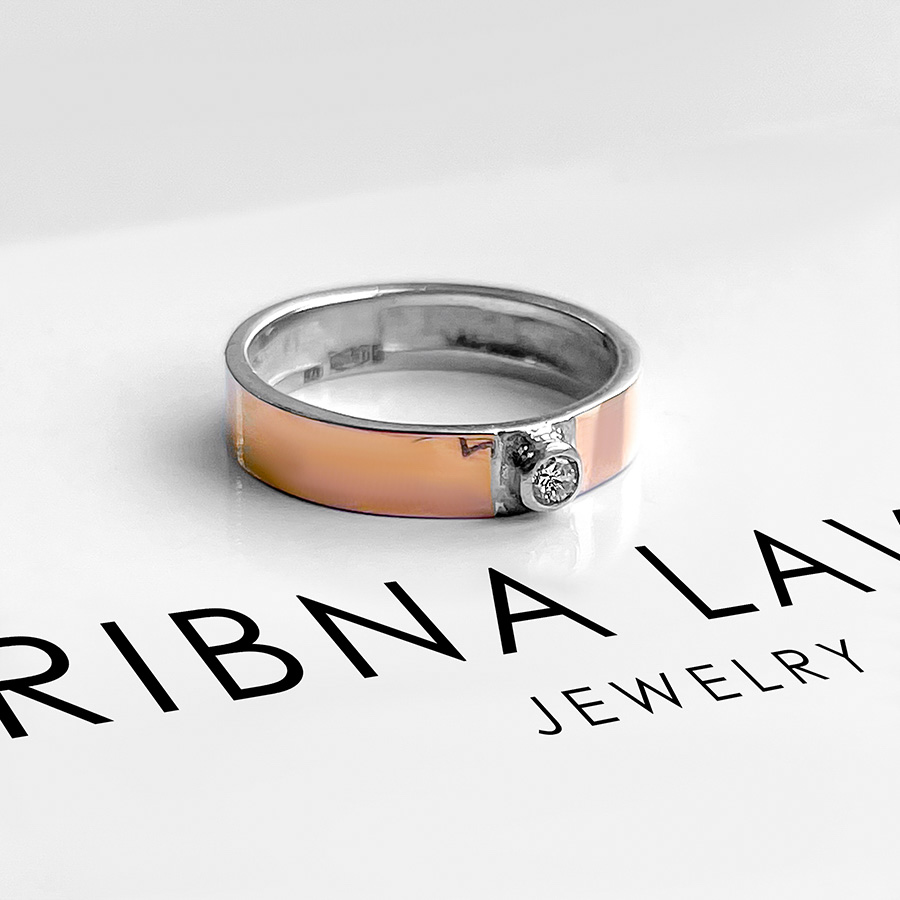Срібна каблучка прикрашена вставками із натурального золота та фіанітами із діамантовим ограновуванням.