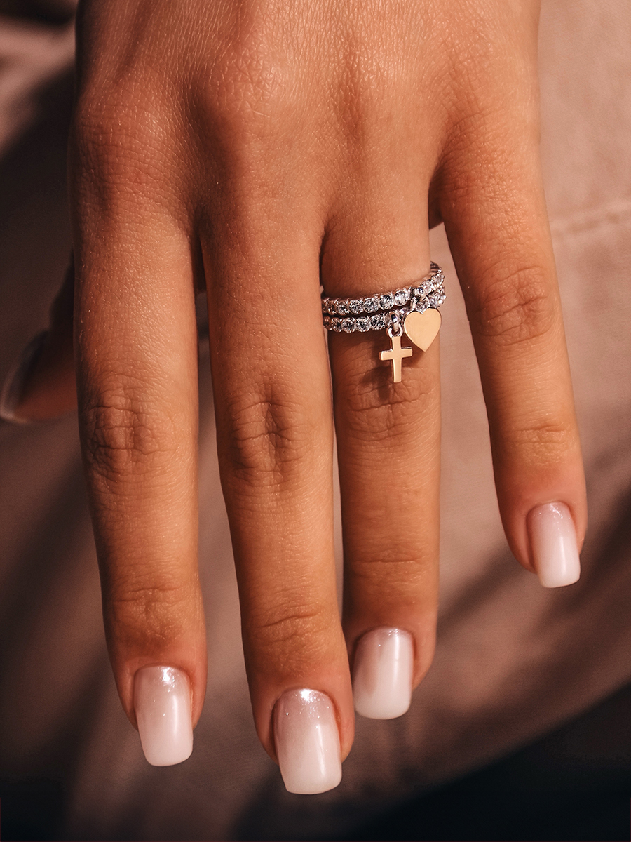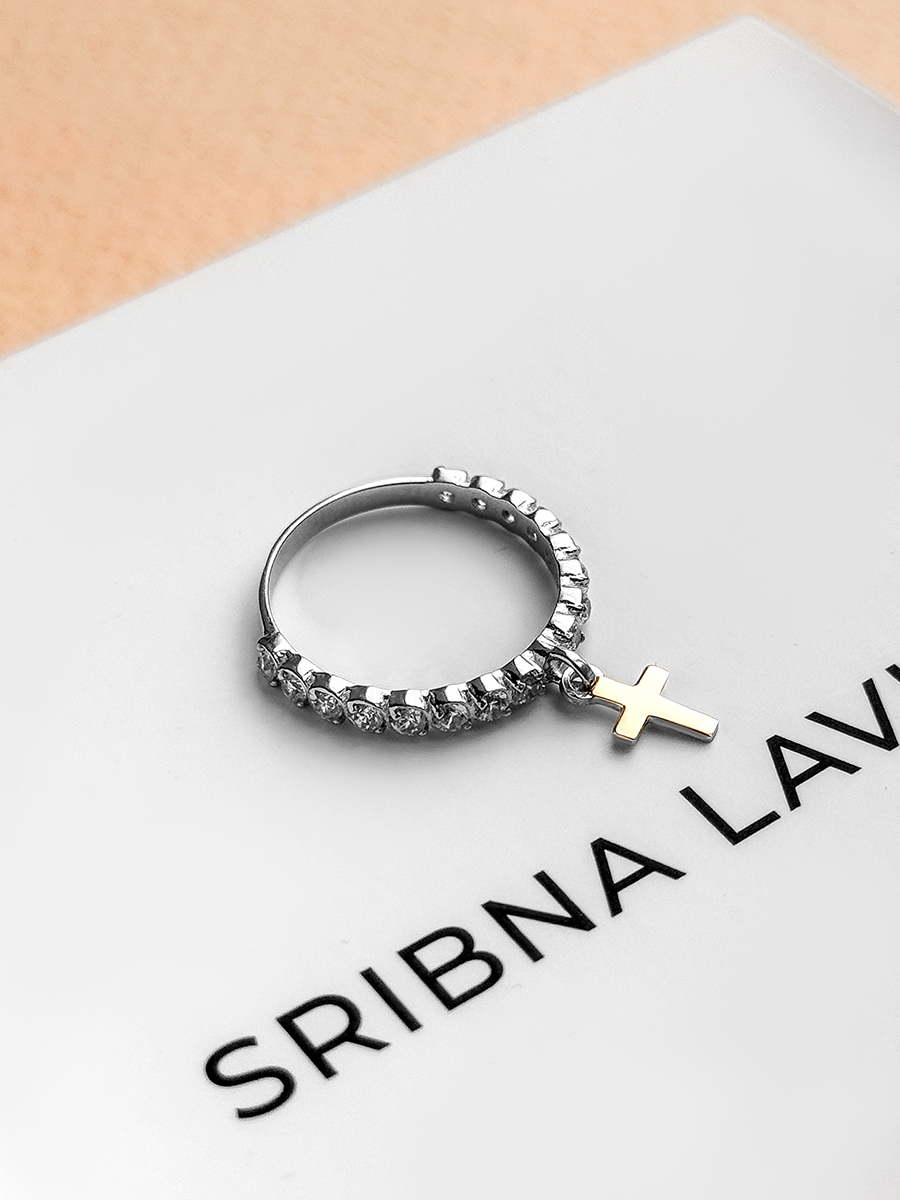 Срібна каблучка із доріжкою фіанітів та підвіскою у вигляді хрестика зі вставкою натурального золота. Каблучку вкрито родієм для додаткового захисту та сяйва а фіаніти мають діамантове ограновування.