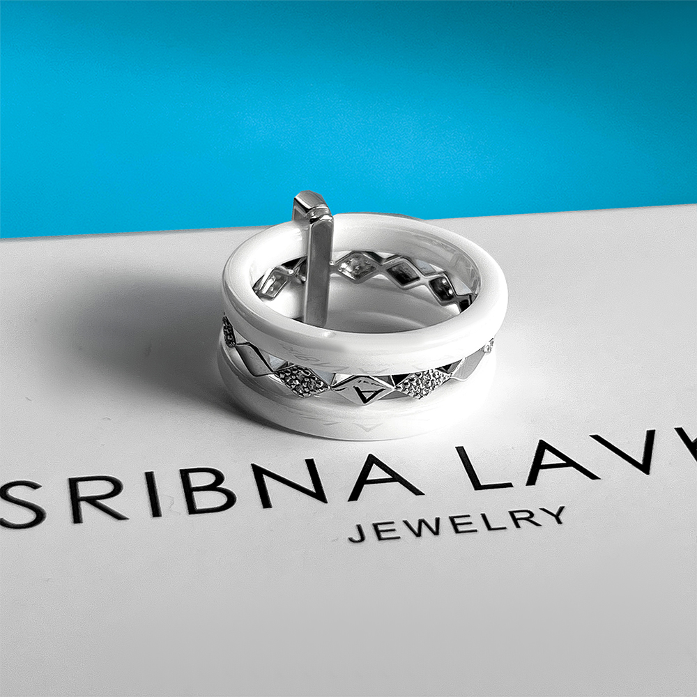 Каблучка з ювелірної кераміки та срібла із фіанітами.