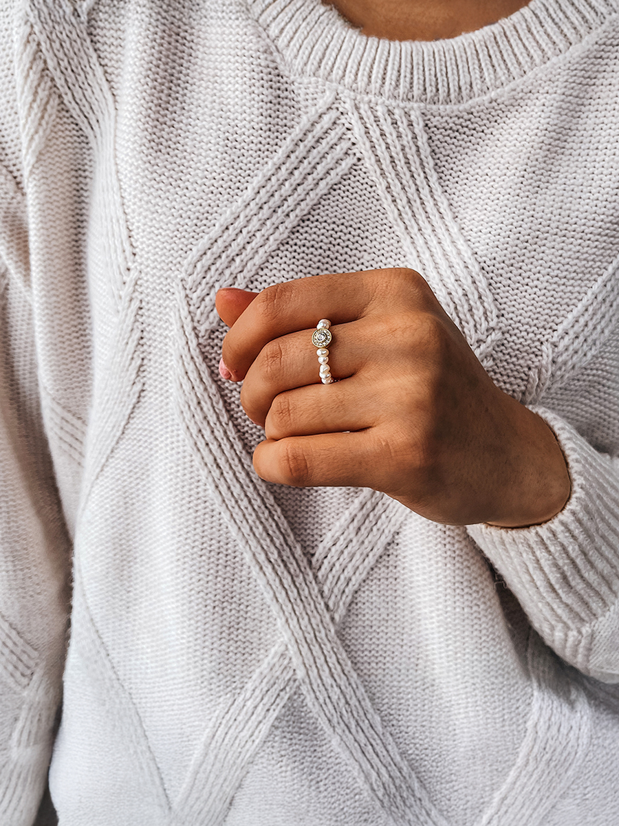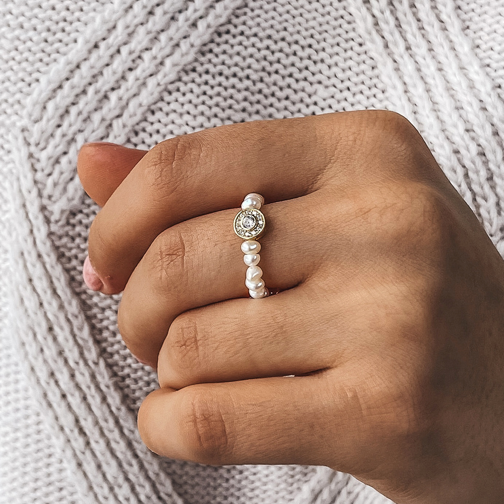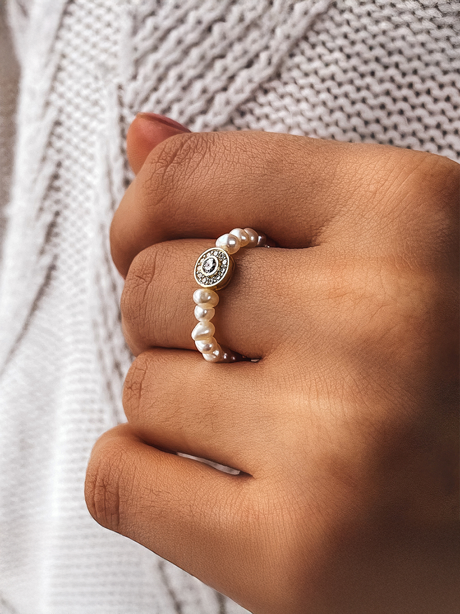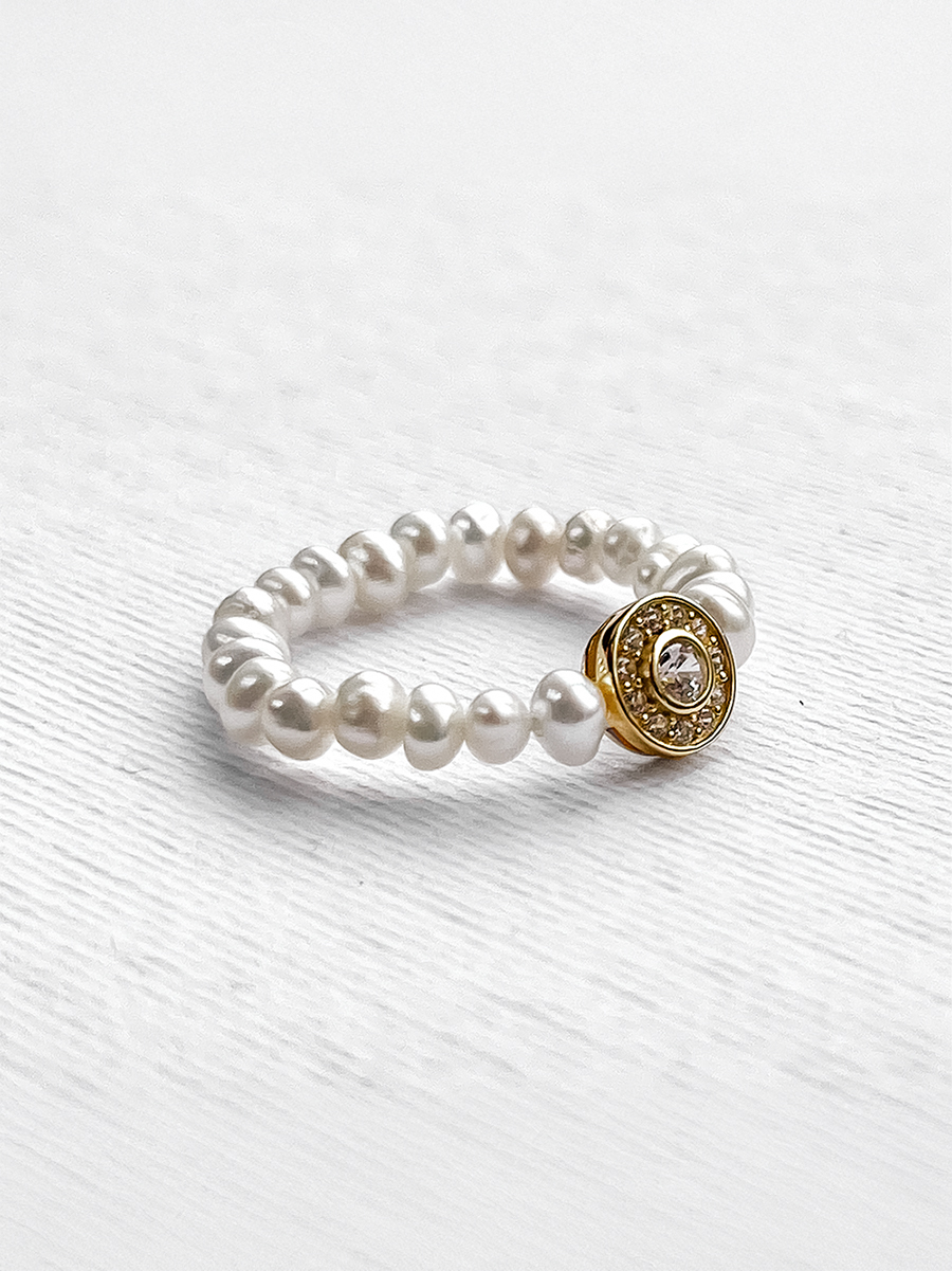 Незвичайна каблучка створена із натуральних перлинок, фіанітів та позолоченого срібла. Основа - ювелірна гумова жилка.