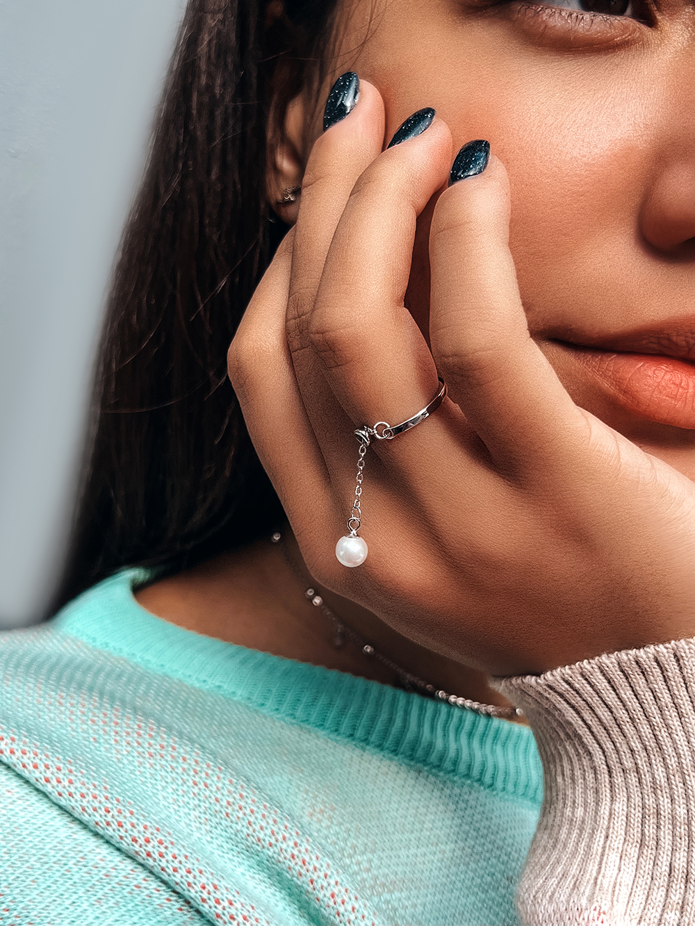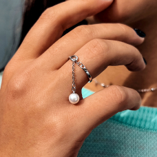 Срібна каблучка прикрашена тоненькою доріжкою фіанітів та підвіскою із натуральної прісноводної перлинки на якірному ланцюжку.