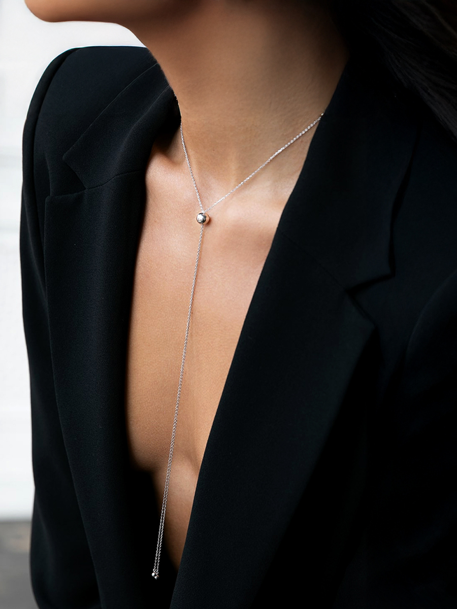 Стильне срібне кольє-краватка. Носіть с жакетом, сорочками, светрами і самі вирішуйте якою довжиною буде ваше кольє за допомогою слайдера у вигляді дзеркальної кульки. Загальна довжина 80 см, діаметр кульки 7 мм.