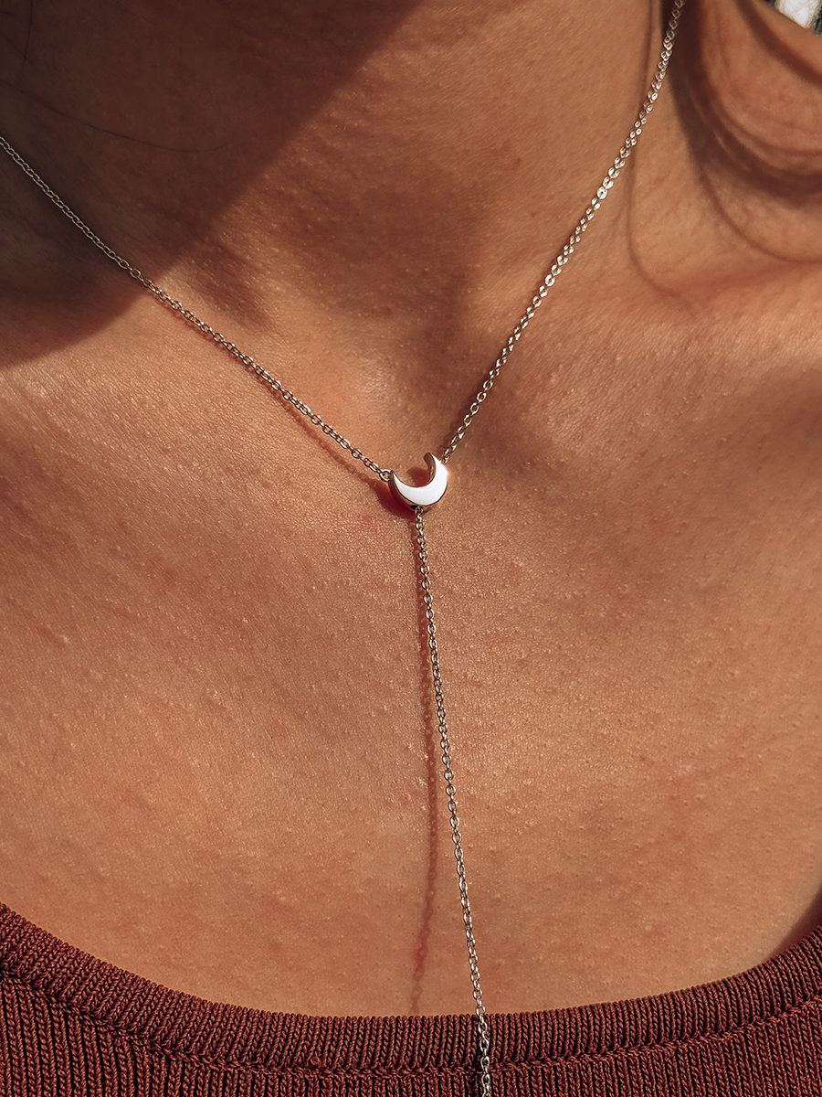 Лаконічне срібне кольє з підвісками у вигляді місяців, холодний блиск срібла і нічого зайвого.Носіть с жакетом, сорочками, светрами і самі вирішуйте якою довжиною буде ваше кольє.