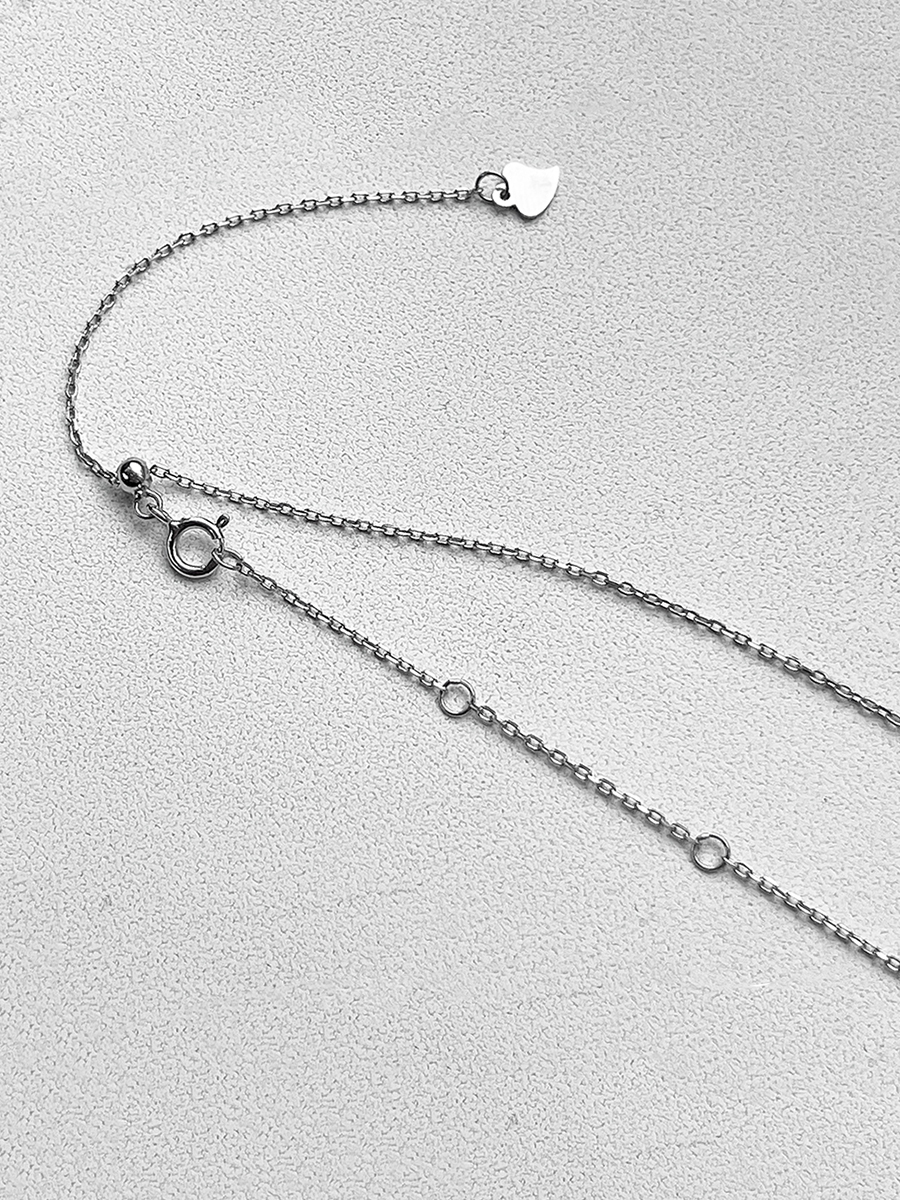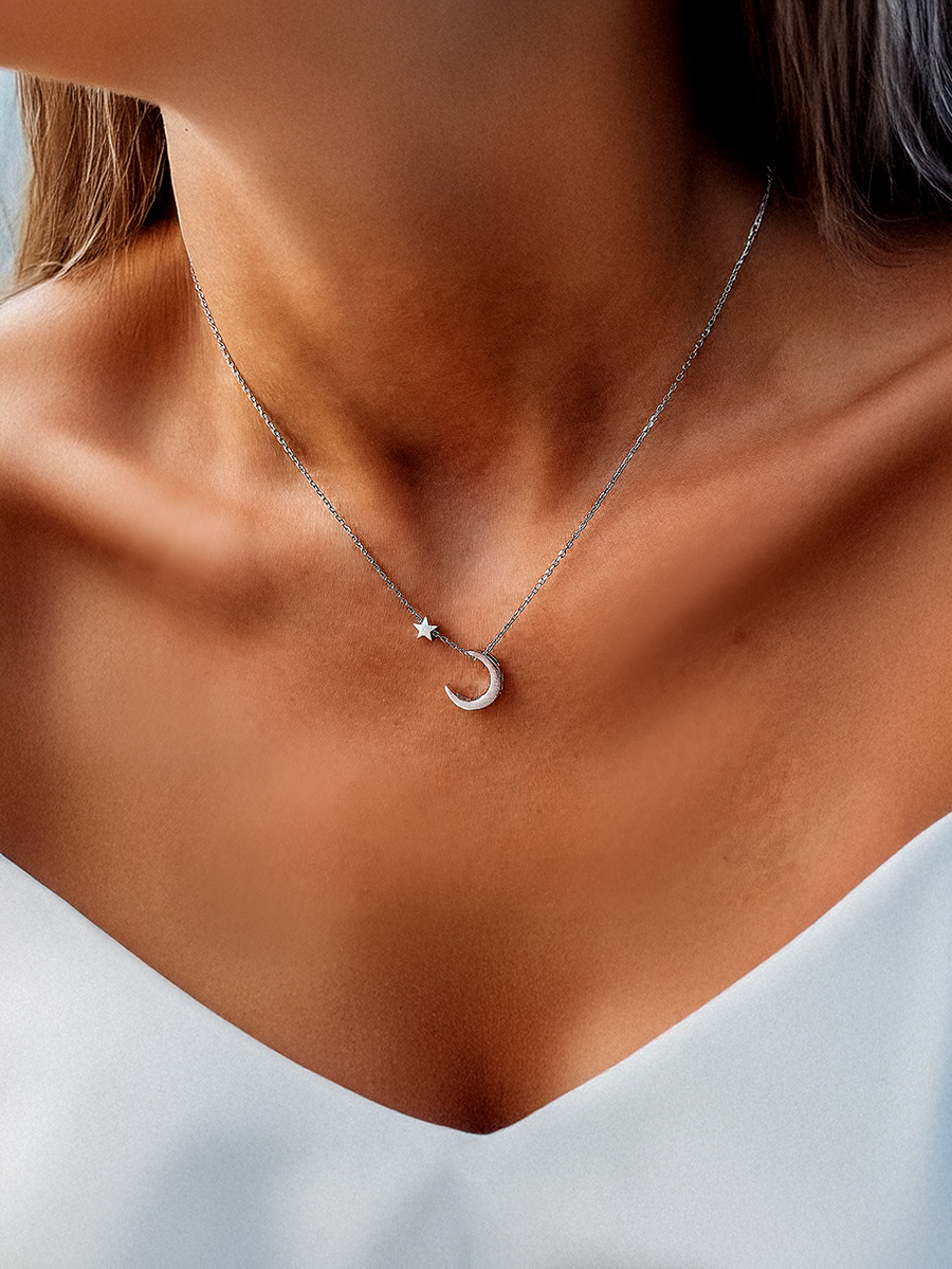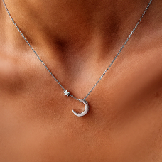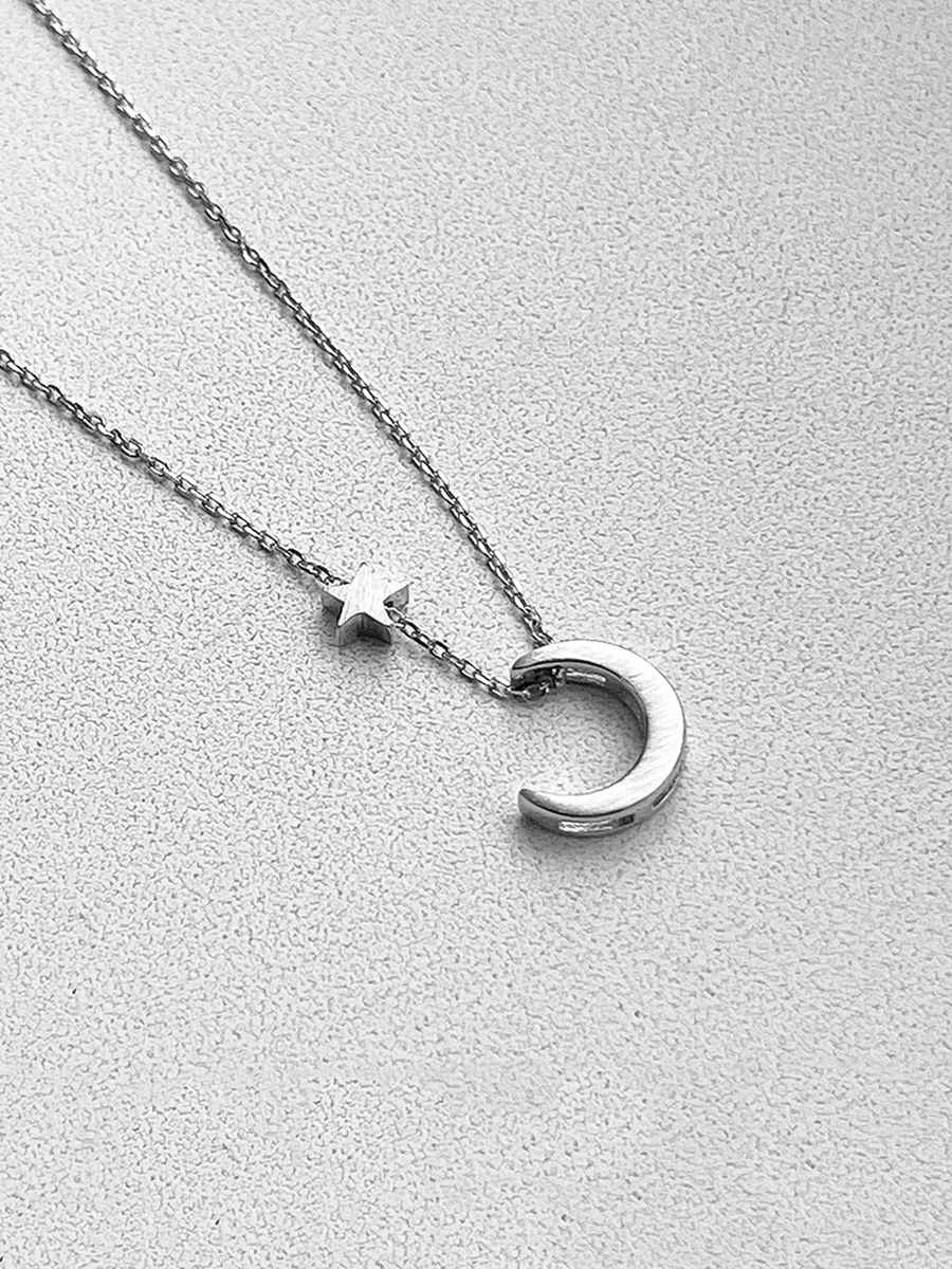 Срібне кольє з місяцем та зіркою які мають матову поверхню. Ланцюжок оснащено інноваційною застібкою-слайдер яка дозволяє легко регулювати довжину прикраси.