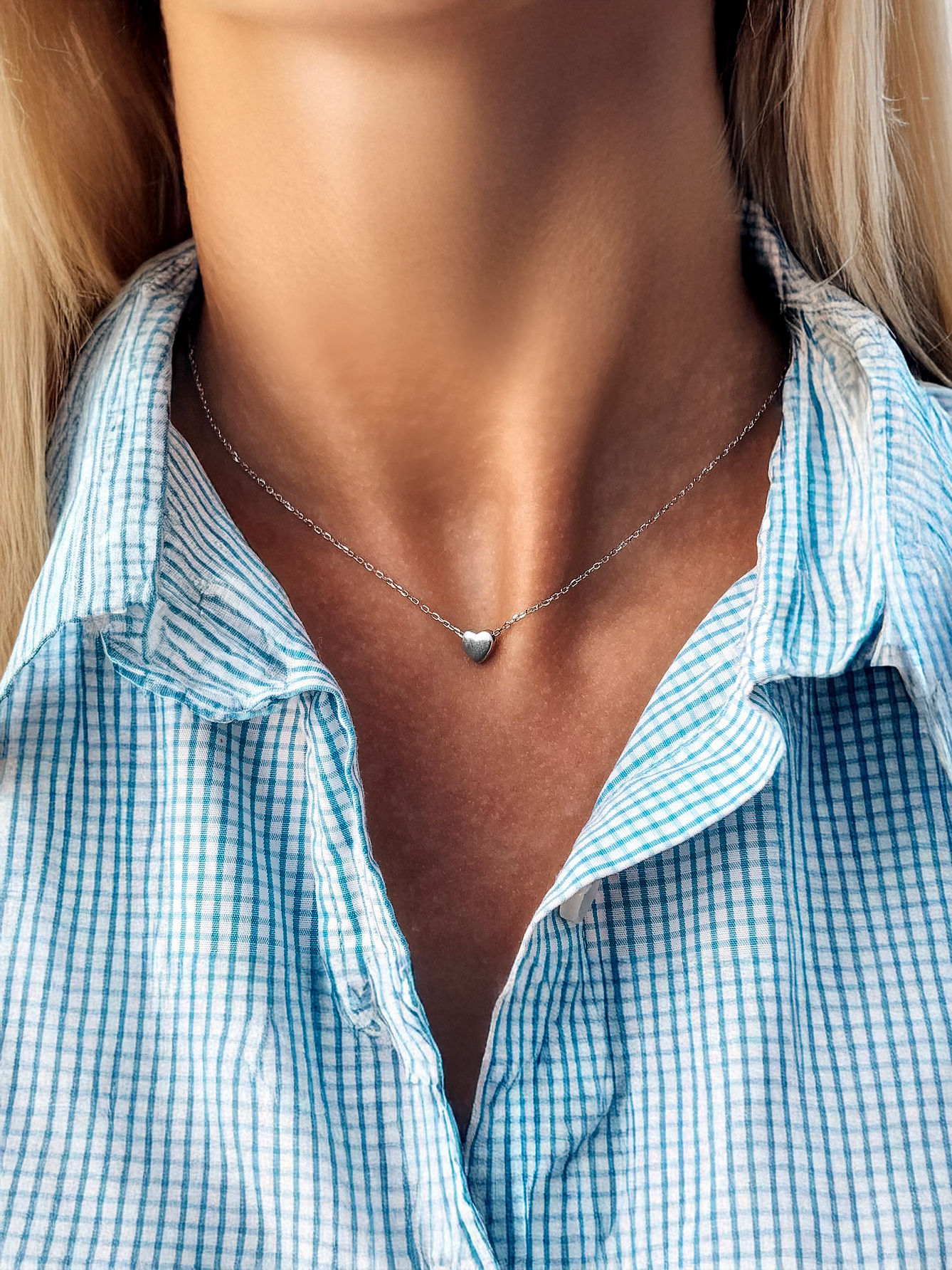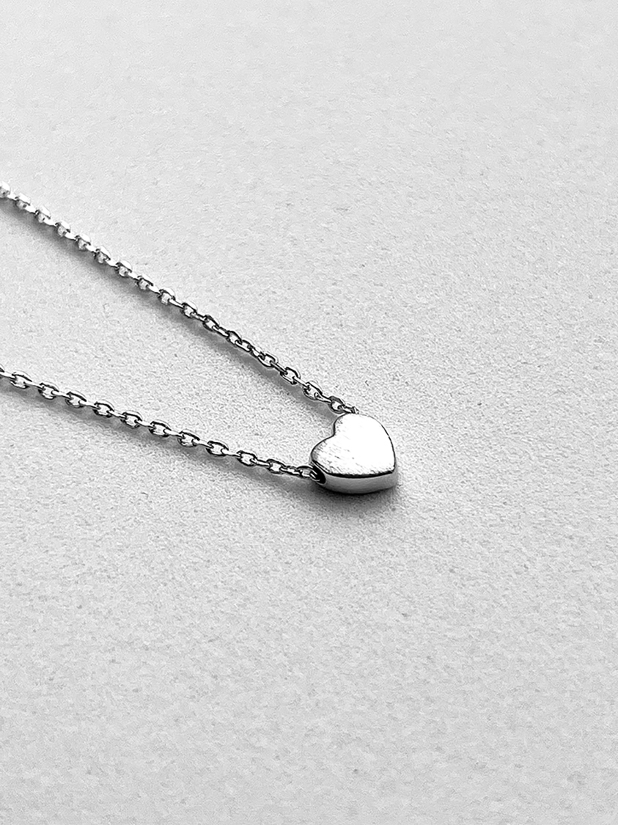 Срібне кольє з підвіскою у вигляді серця яка має матову поверхню. Ланцюжок оснащено інноваційною застібкою-слайдер яка дозволяє легко регулювати довжину прикраси.