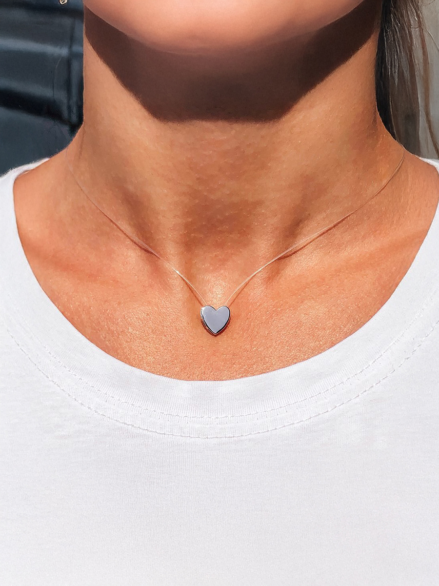 Срібне кольє у вигляді сяючого серця на прозорій жилці.