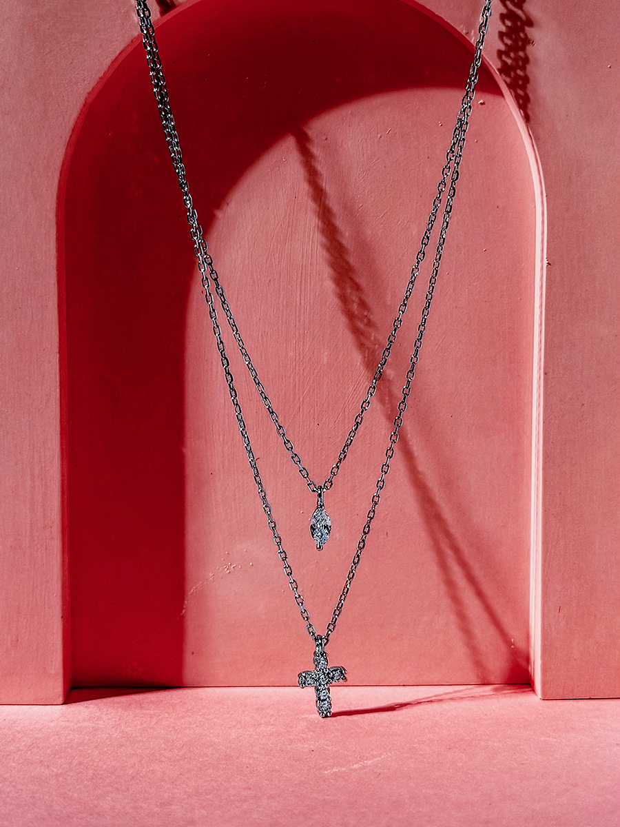 Ніжне подвійне кольє зі срібла з підвісками у вигляді хрестика та краплинки із фіанітами 5А. Довжина ланцюжків 40 та 45 см..Подовжувач 5 см. Розмір хрестика - 8х10 мм.,краплинка - 8х3 мм.