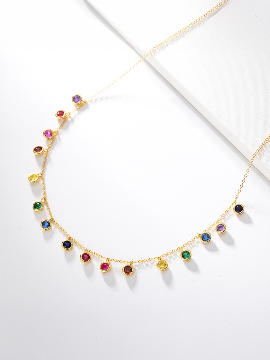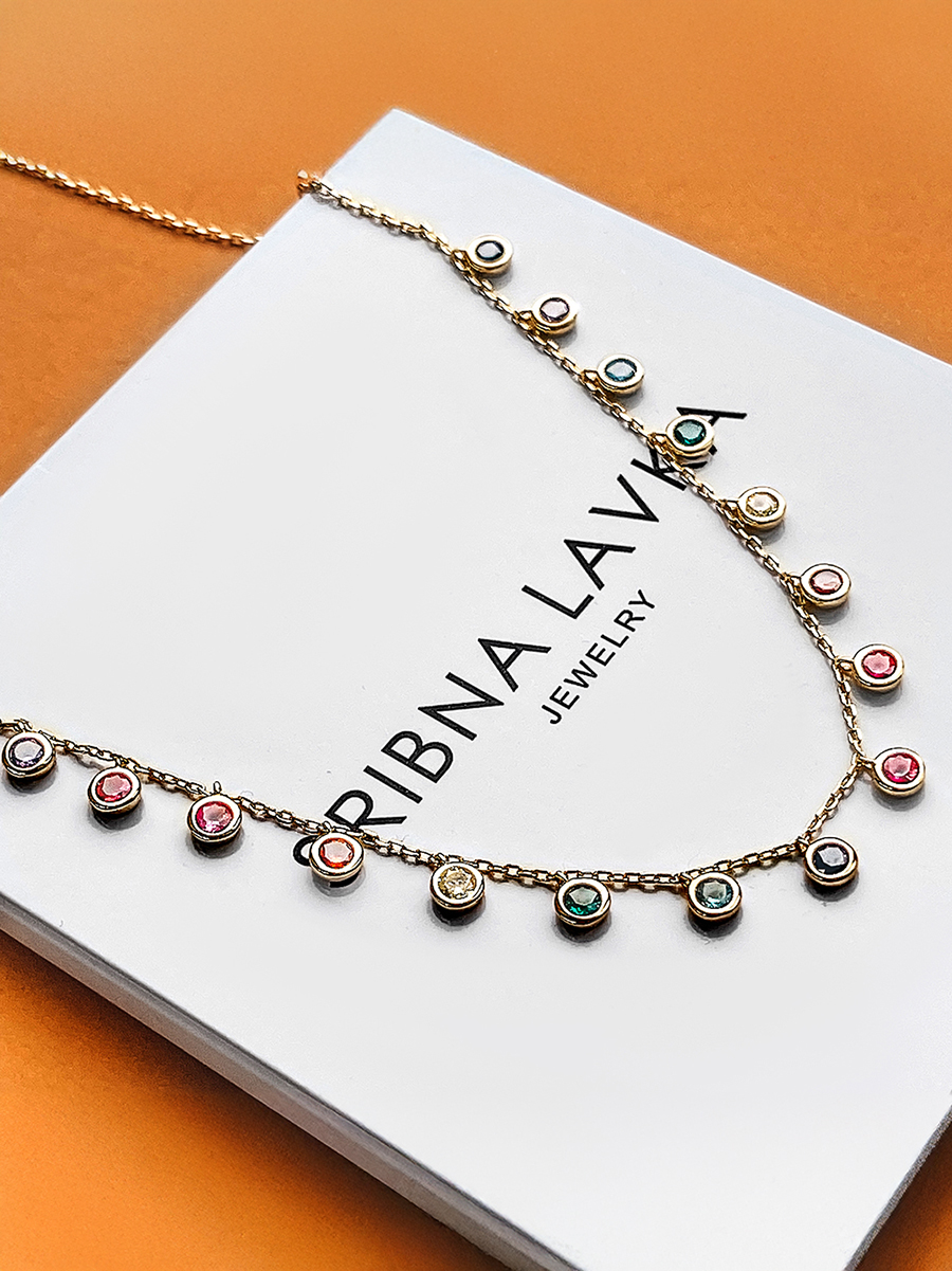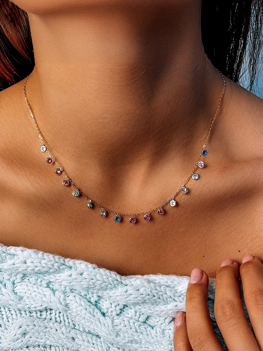 Яскраве срібне кольє з кольоровими фіанітами та позолотою. Оснащено регулятором розміру.