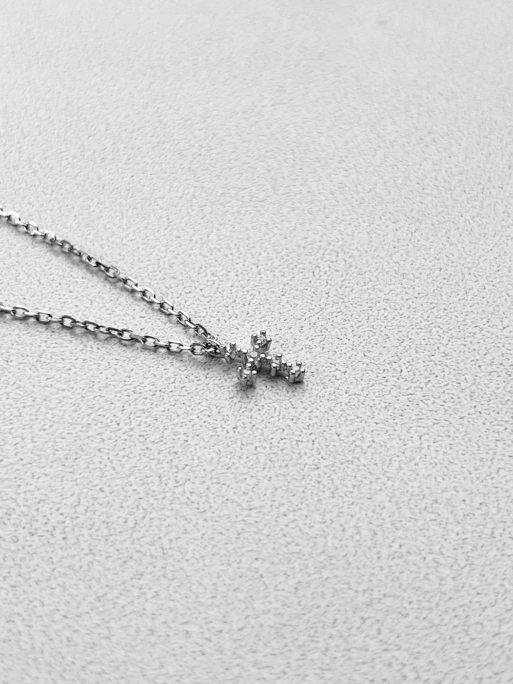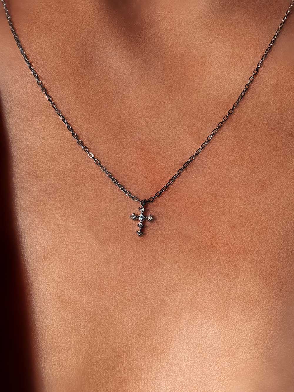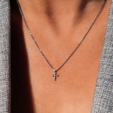 Срібне кольє із ніжним хрестиком з фіанітами. Оснащено регулятором розміру.