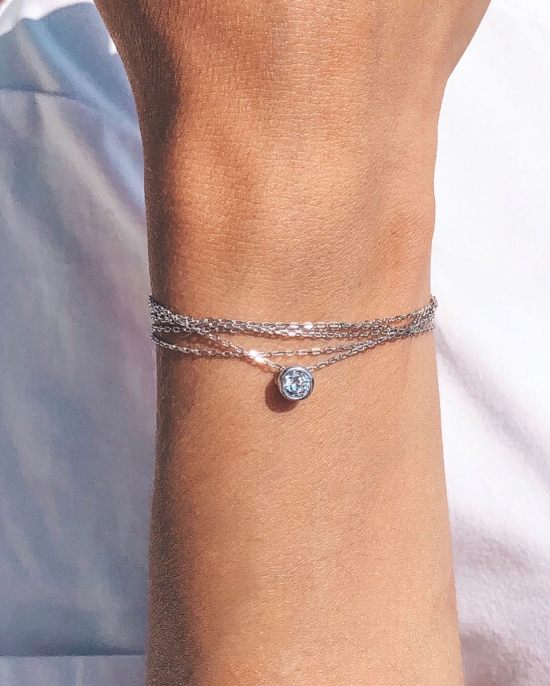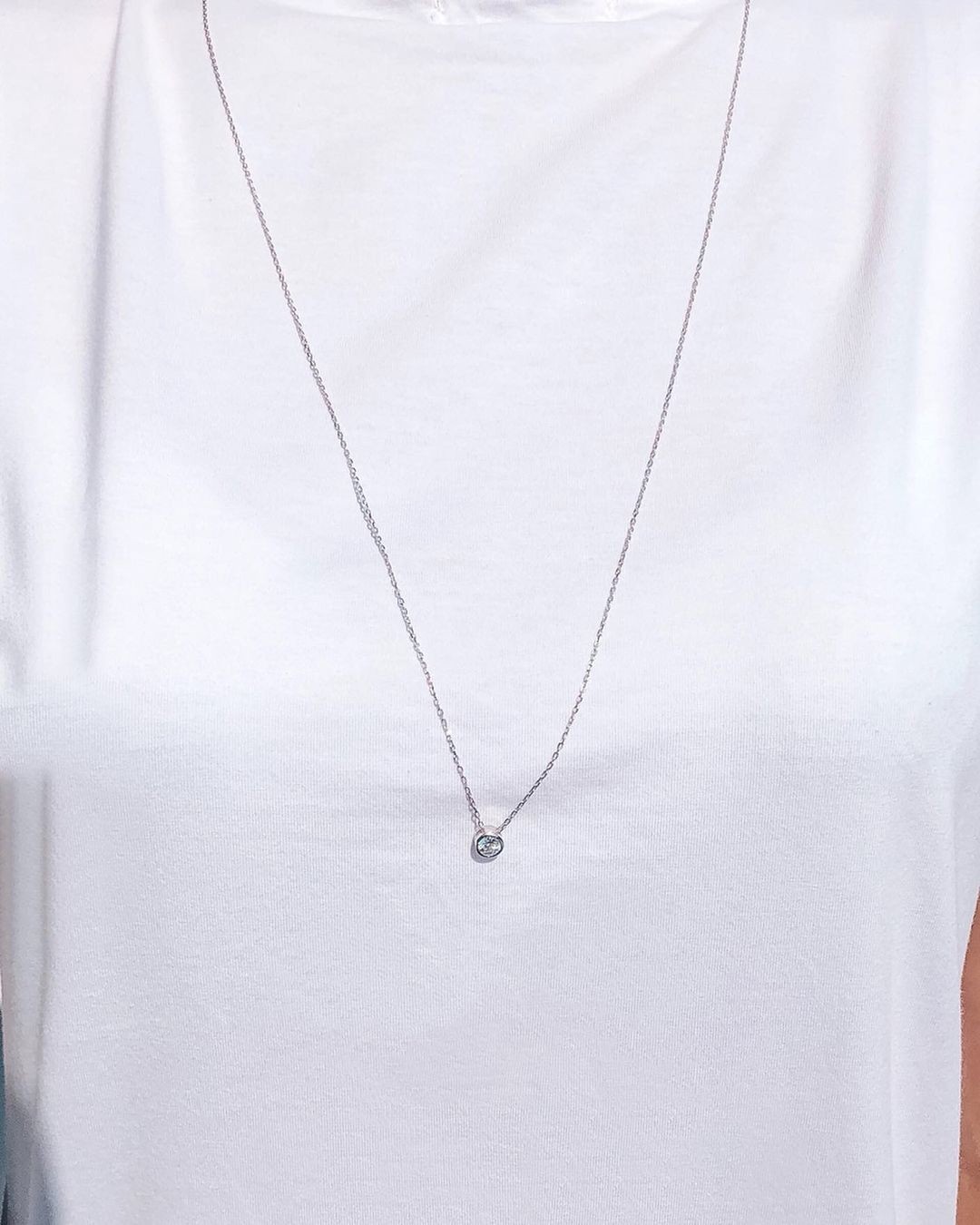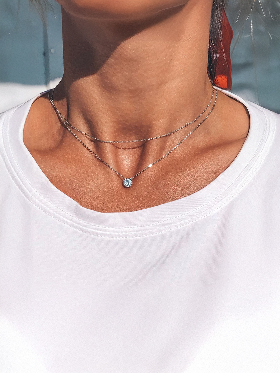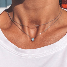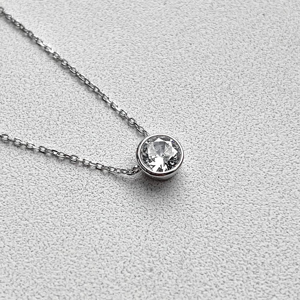 Срібне кольє із яскравим фіанітом та ланцюжком 90 см. з регулятором розміру слайдер. Даний аксесуар ви можете одягагати огорнувши декілька разів навколо шиї, або носити поверх одягу як довге кольє.