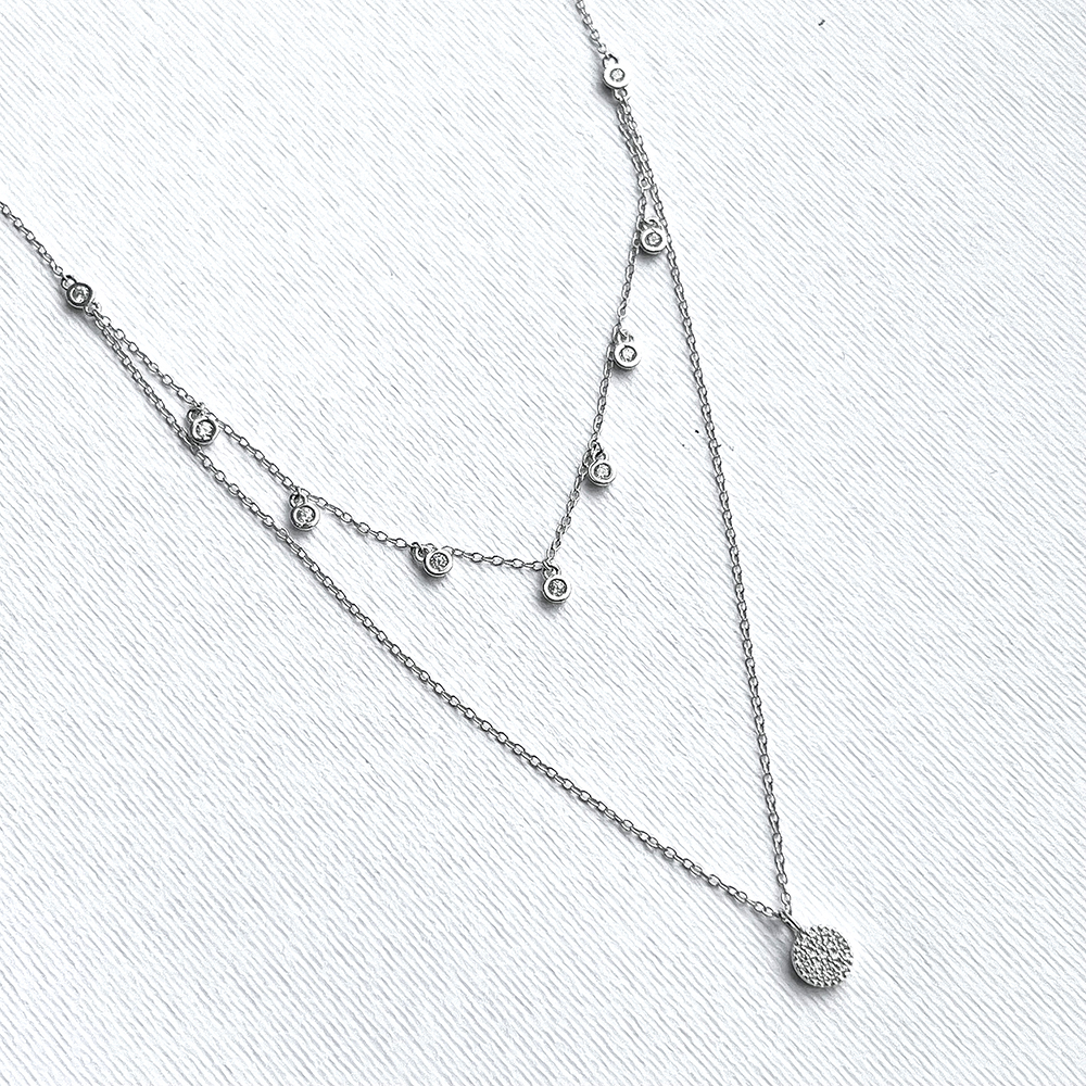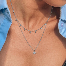 Подвійне срібне кольє з підвісками із фіанітами. Довжина ланцюжків 40 та 45 см. а також кольє оснащено регулятором розміру +5 см.