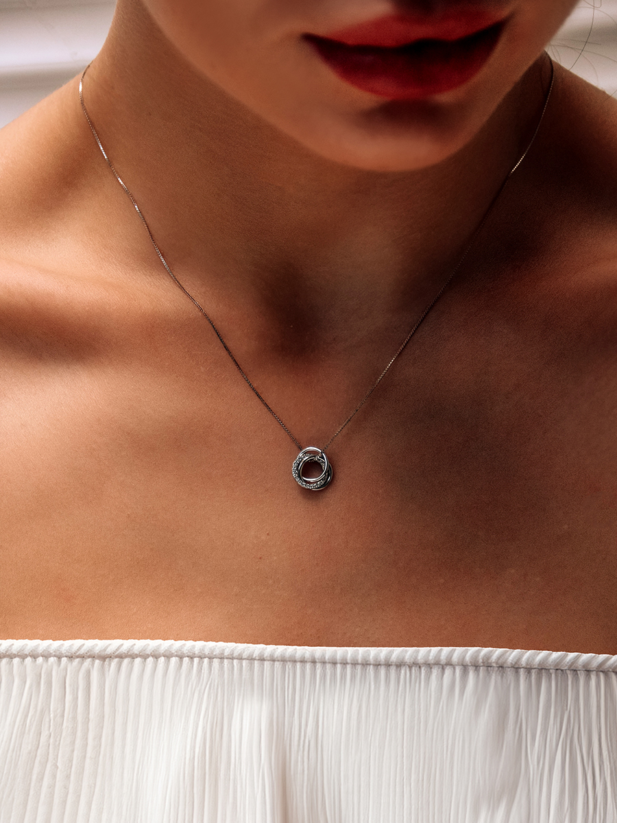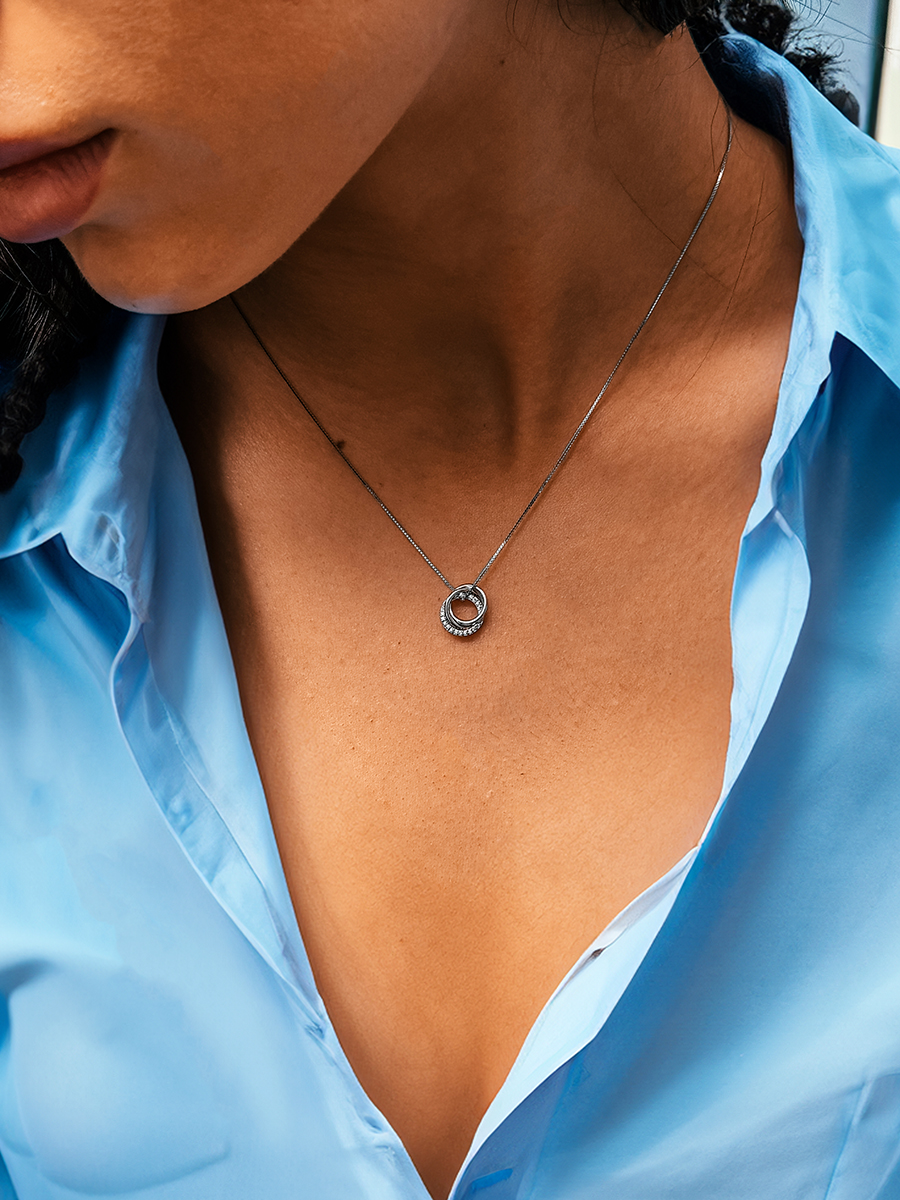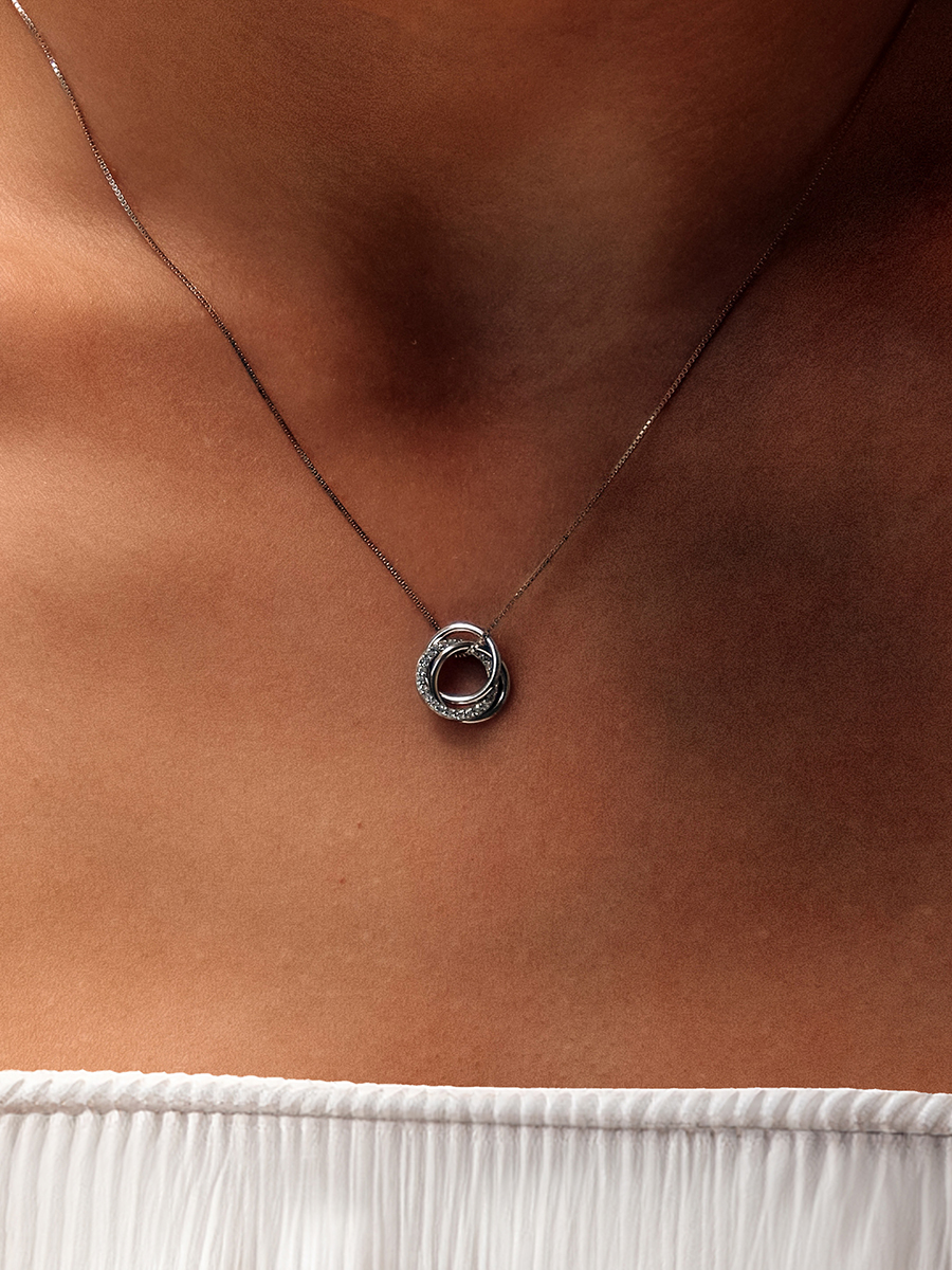 Стильне срібне кольє із родієвим покриттям та фіанітами