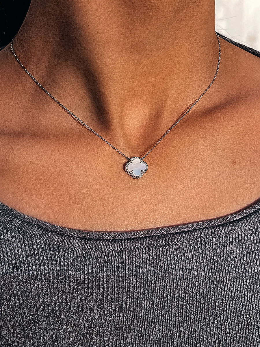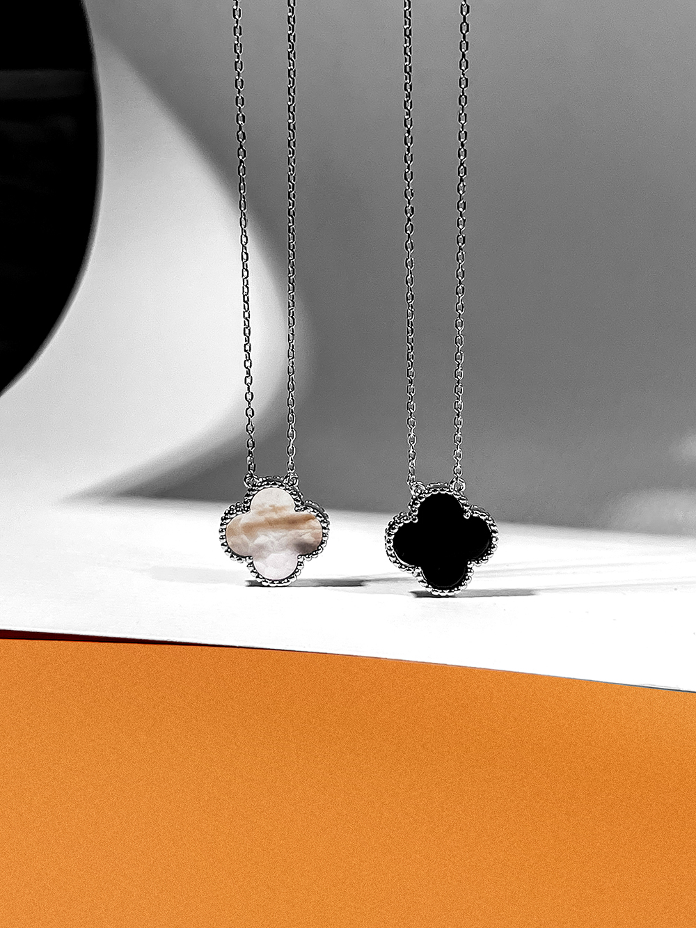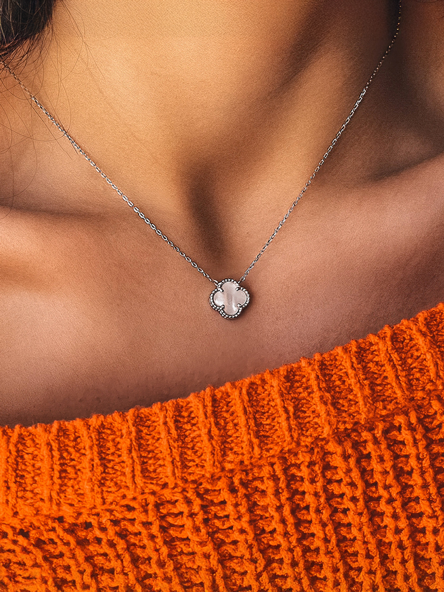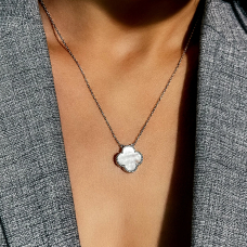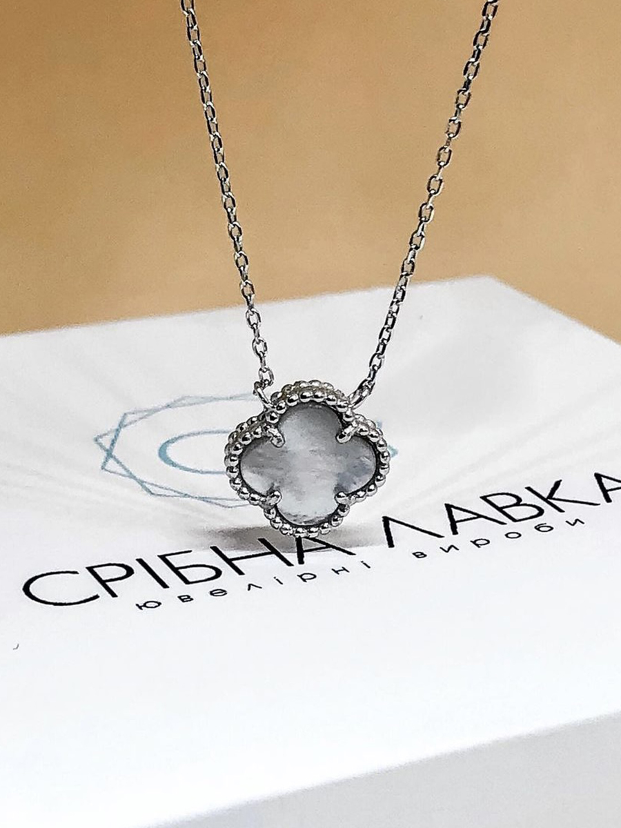 Трендове срібне кольє з чотрилисником який прикрашений перламутрм. Ланцюжок оснащено інноваційною застібкою-слайдер яка дозволяє легко регулювати довжину прикраси.
