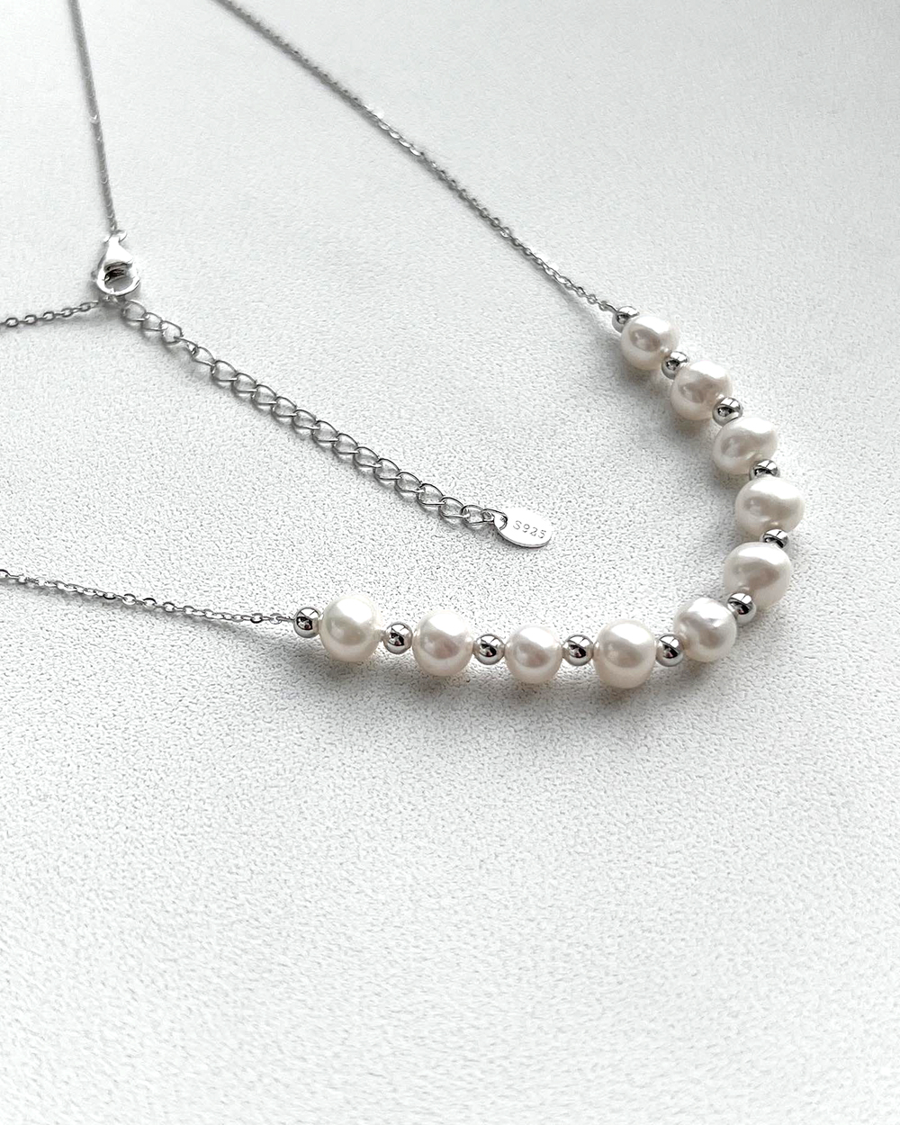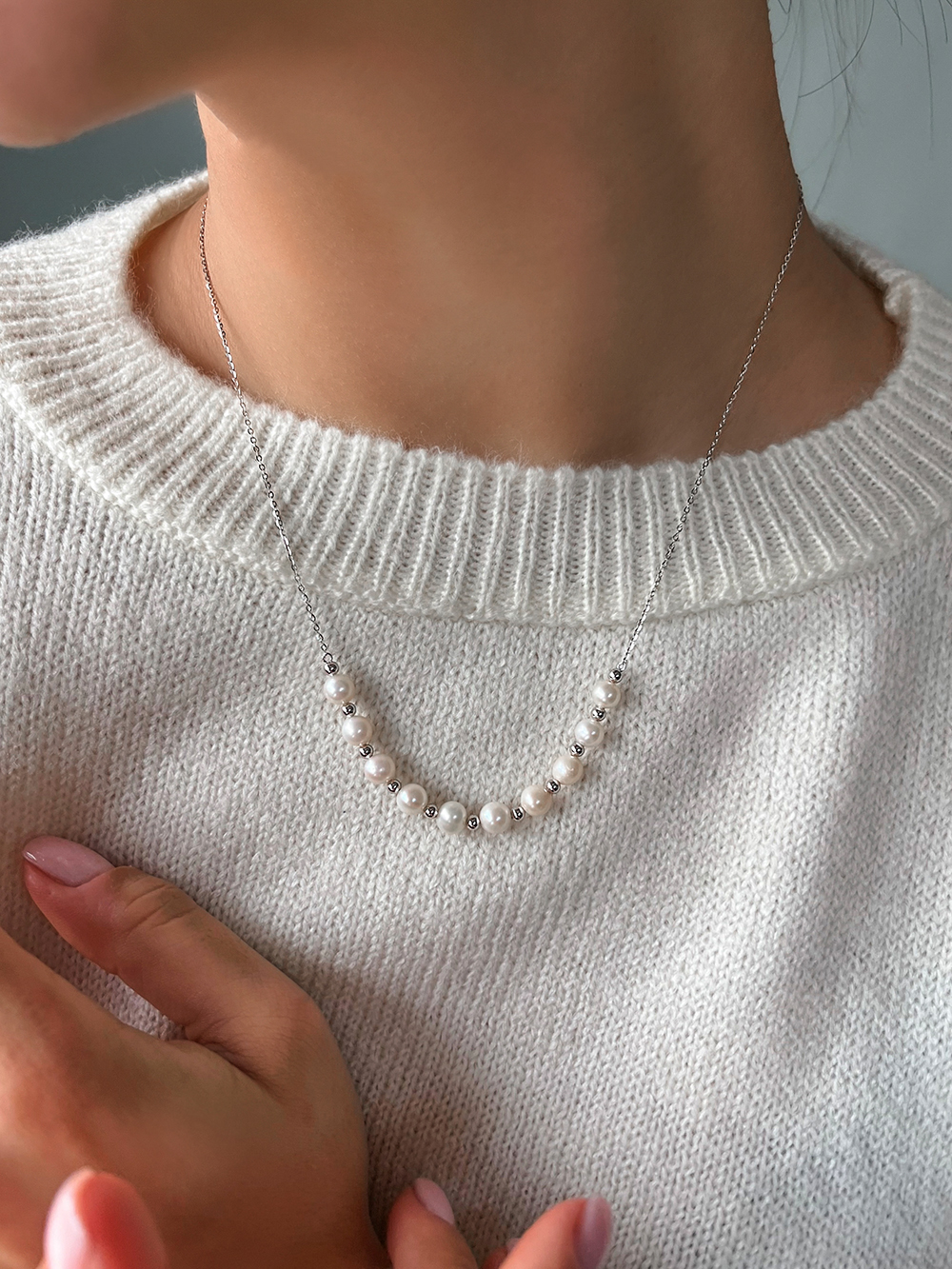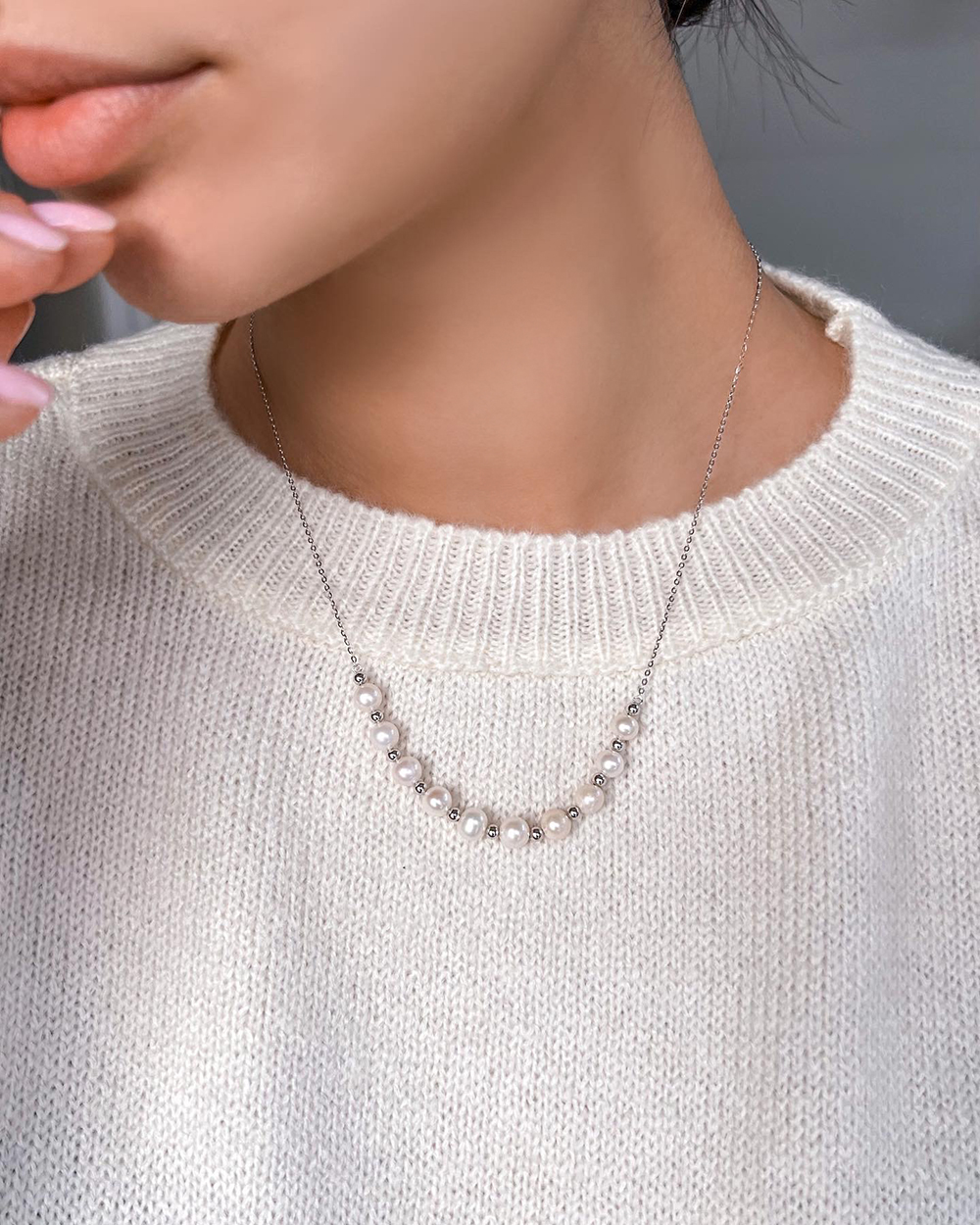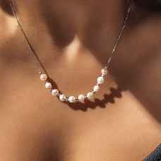 Срібне кольє із родієвим покриттям та натуральними прісноводними перлами.