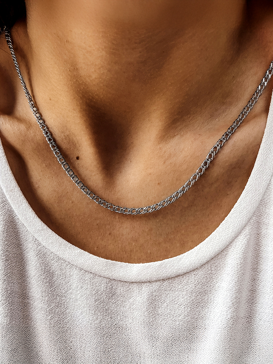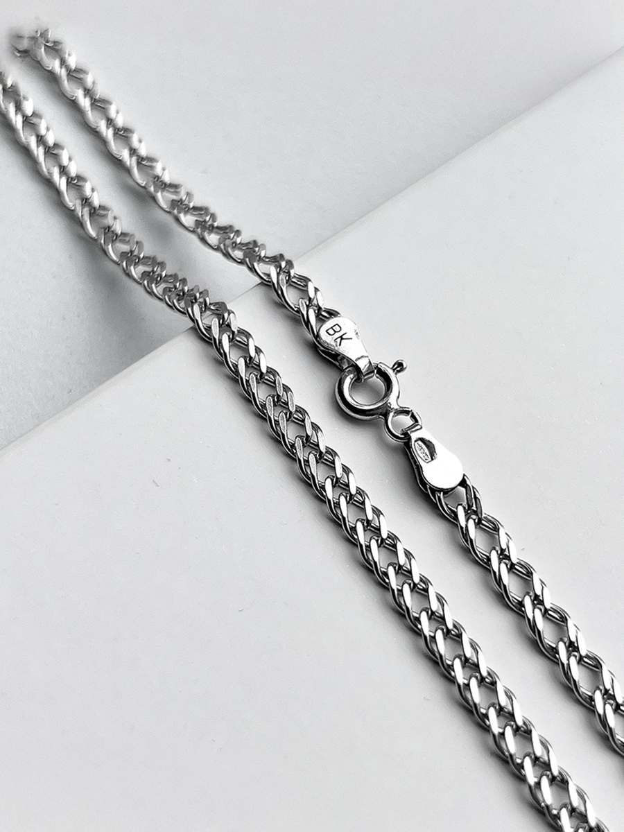 Срібний ланцюжок 925-ї проби із родієвим покриттям та алмазним огранюванням, яке надає йому неперевершеного сяйва і блиску. Плетіння Подвійний Ромб - це класичне плетіння яке не ділиться гендерно та підходить як для чоловіків так і для жінок