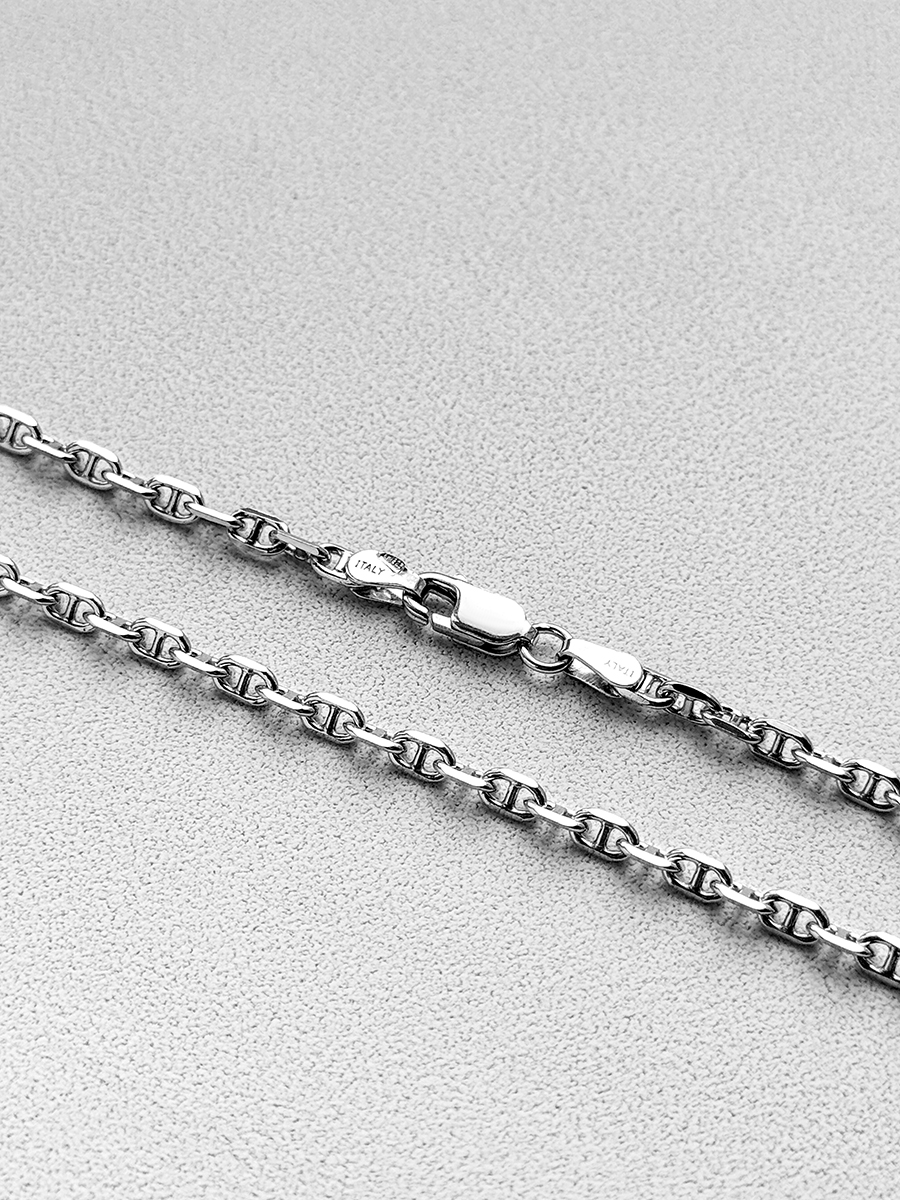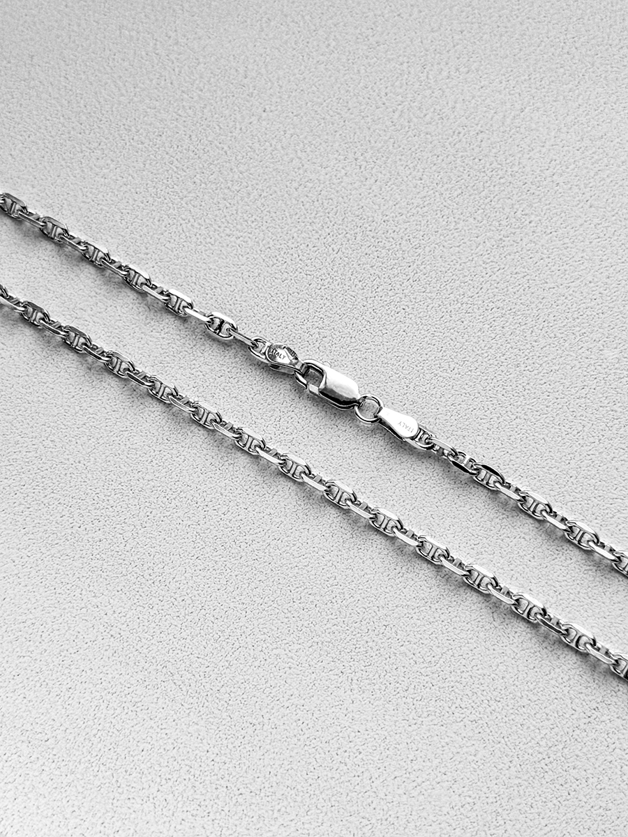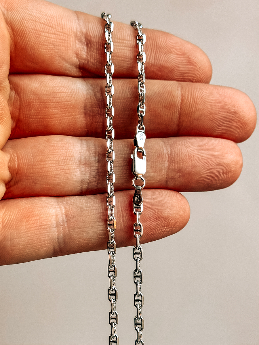 Срібний ланцюжок 925-ї проби з родієвим покриттям та алмазним огранюванням, що надає йому неперевершеного сяйва і блиску. Якірне плетіння – класичний стиль, який не має гендерних обмежень і підходить як чоловікам, так і жінкам.