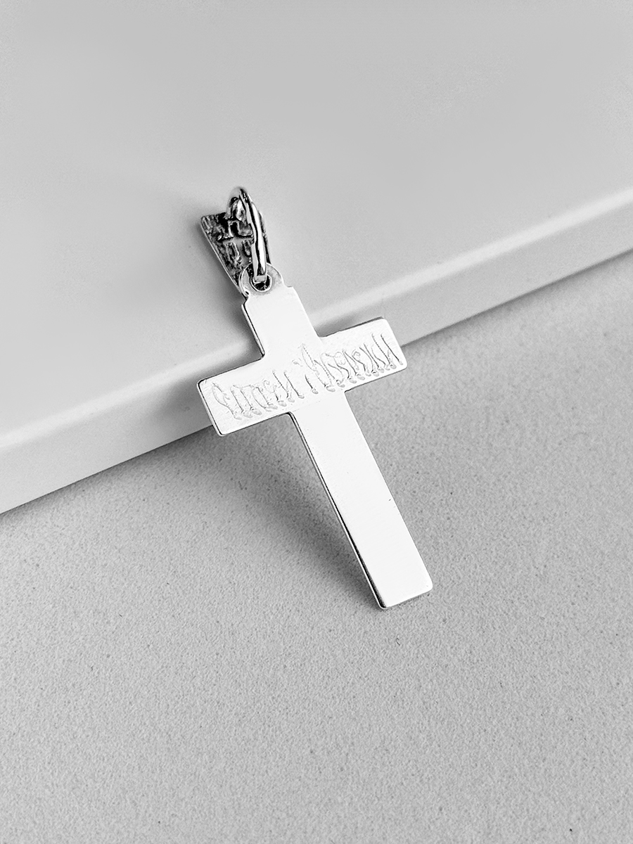 Довершений вручну срібний хрестик 925-ї проби з розп'яттям. Розмір без вушка 30х18 мм.